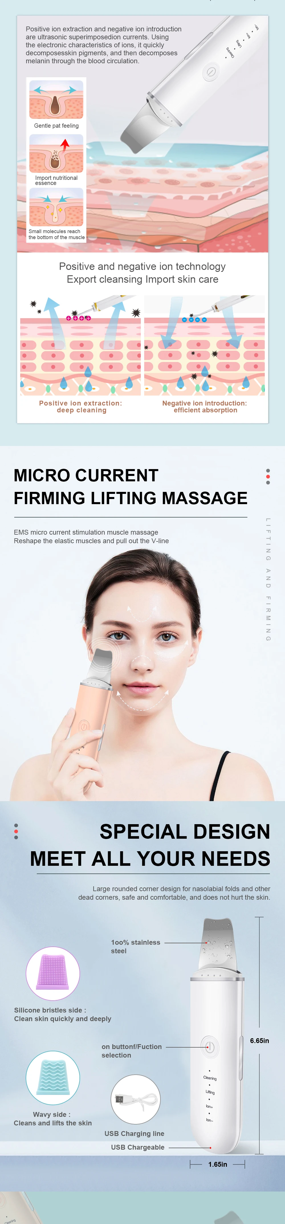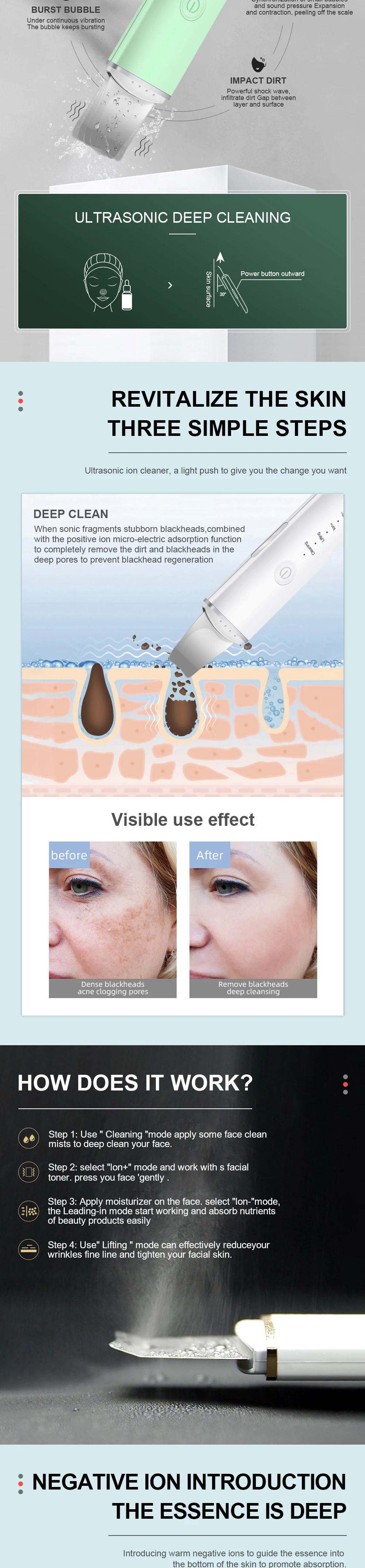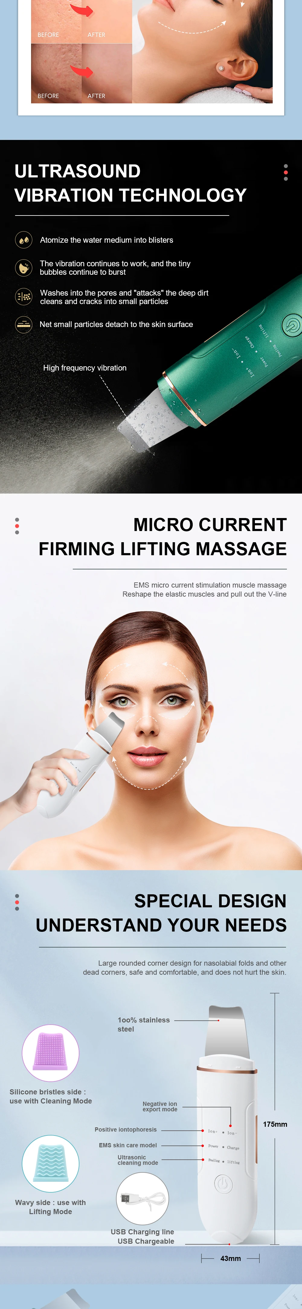 Ультразвуковой скребок для кожи вибрационный очиститель для лица, удаление черных точек, скребок для лица, лопатка, очистка, кавитация, пилинг