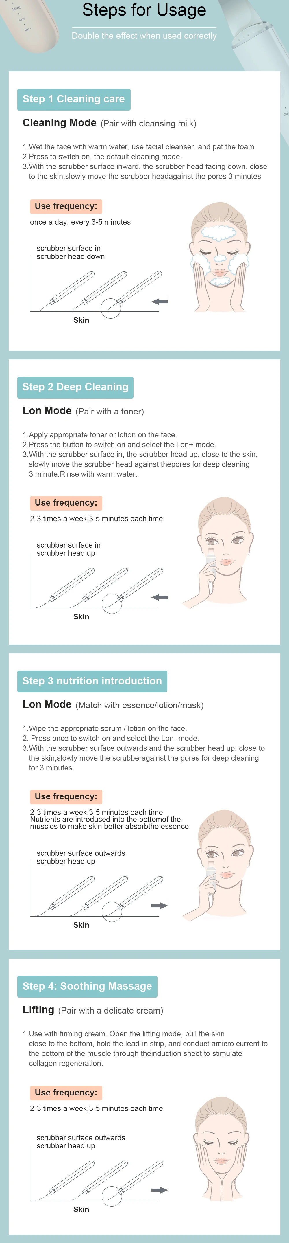 1. Глубокое очищение: способ 45 градусного угла для ускорения метаболизма клеток эпидермики и обновления его нормального уровня обновления, повышает выпадение пожилых и нерегулярных аберрантных клеток, смягчает кератин, отрегулируйте эпидермические клетки, восстановив эластичность кожи и обратившись к твердой, гладкой и нежной коже. 2. Лидирующий в питании и активации кожи путем принятия ультразвуковой вибрации и тепидного эффекта, он может способствовать циркуляции крови внутри дермы, ускоряет лимфатический возврат, токсин разряда, который накапливается в более глубокой коже и устраняет мертвые клетки, чтобы избежать чрезмерного скопления клеток корнеозного слоя, таким образом, чтобы вода и питание быстро переносились, Улучшает проницаемость клеток, укрепляет уход за кожей, улучшает увлажнение кожи.