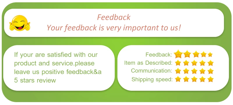 Отзывы1. Ваше удовлетворение-наша единственная цель. Ваши отзывы очень важны для нас.2. Пожалуйста, оставьте нам пять звезд, как только вы будете удовлетворены своей покупкой.3. Пожалуйста, не оставляйте нам негативные отзывы, если вы недовольны своей покупкой, и не стесняйтесь обращаться к нам, мы решим все проблемы с вами.4. Пожалуйста, не открывайте спор по каким-либо причинам, прежде чем связаться с нами, и мы дадим вам хорошее решение.