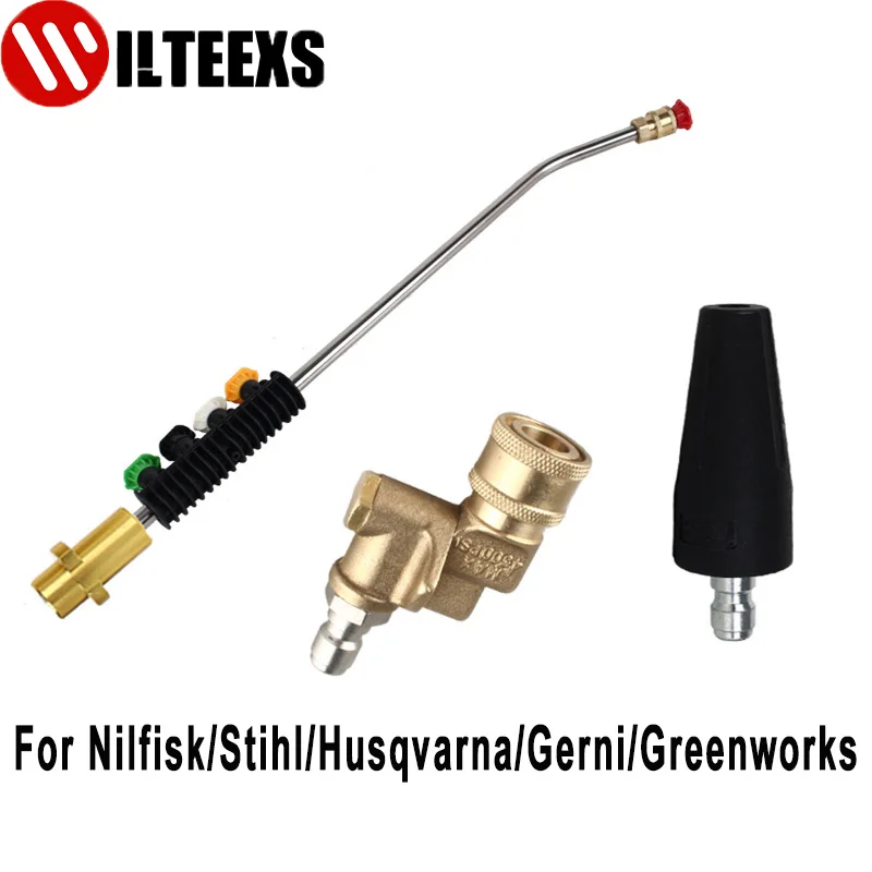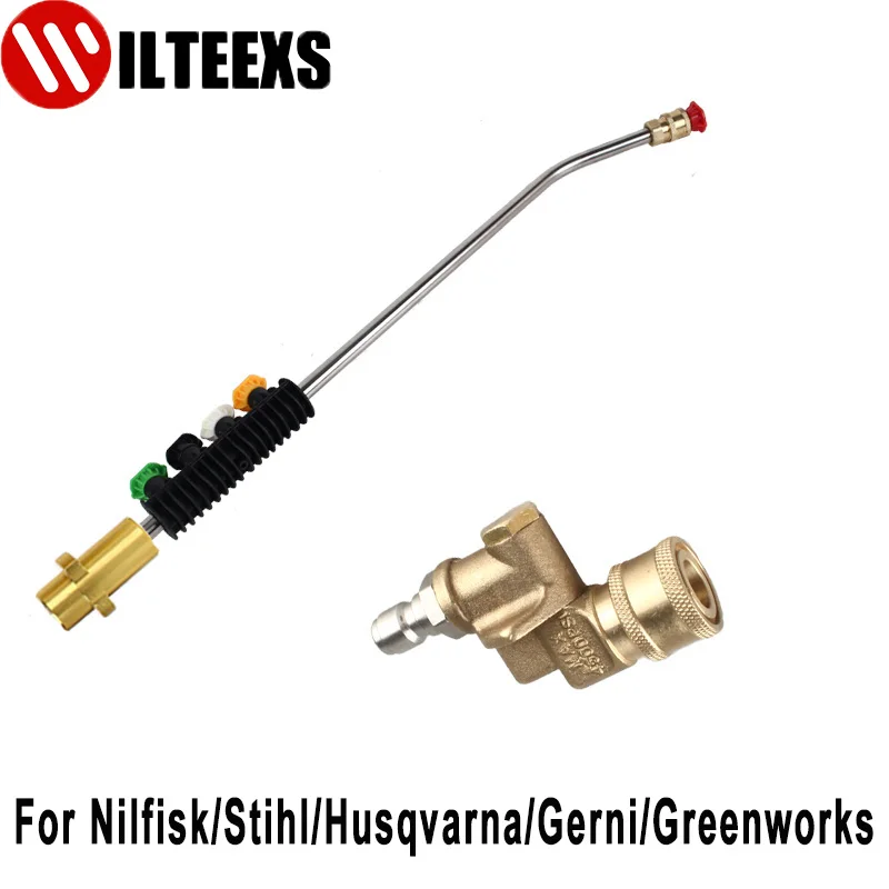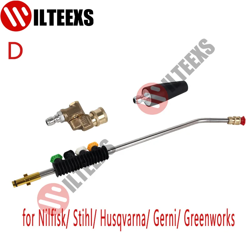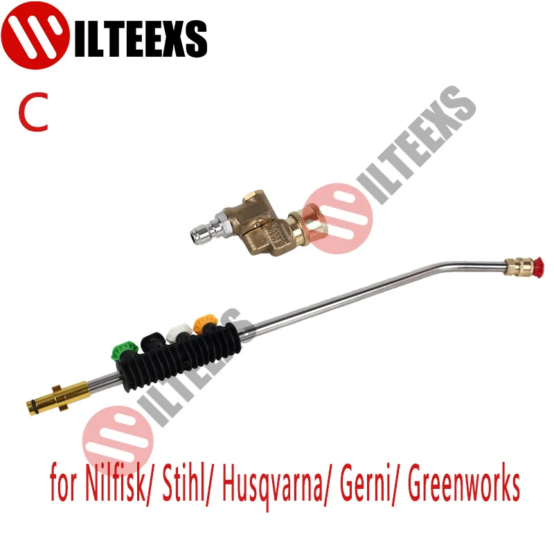 Металлическая Насадка 50 см с адаптером Nilfisk, 5 быстроразъемных наконечников (0o, 15o, 25o, 40o), вращающееся сопло (опционально) и поворотное соединение (опционально), идеально работает с Nilfisk/STIHL мойками давления, которые сделают мощную струйную силу и принесет вам профессиональные ощущения.