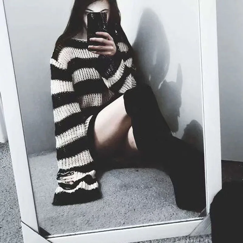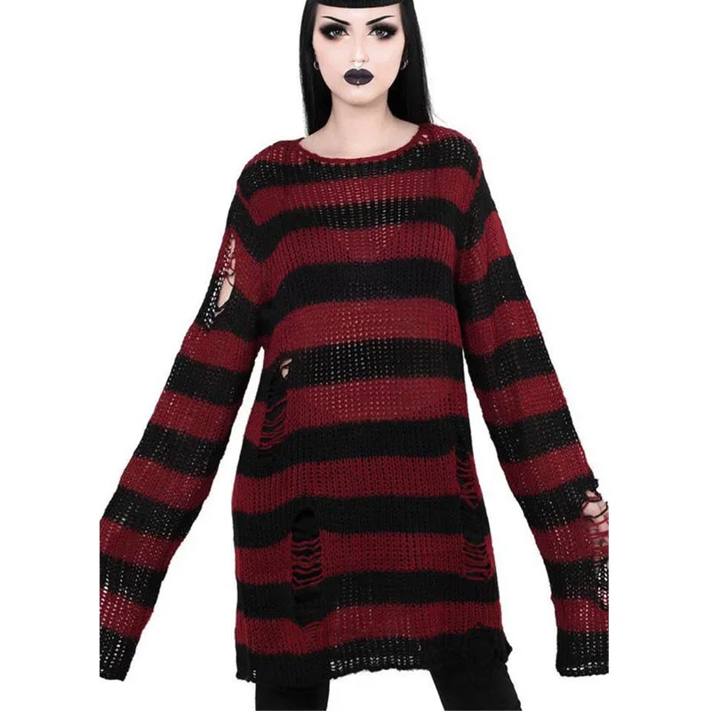 Женский свитер в стиле панк и готика, Летний Полосатый крутой джемпер с вырезами, свободный тонкий темный Топ в стиле рок, 2021