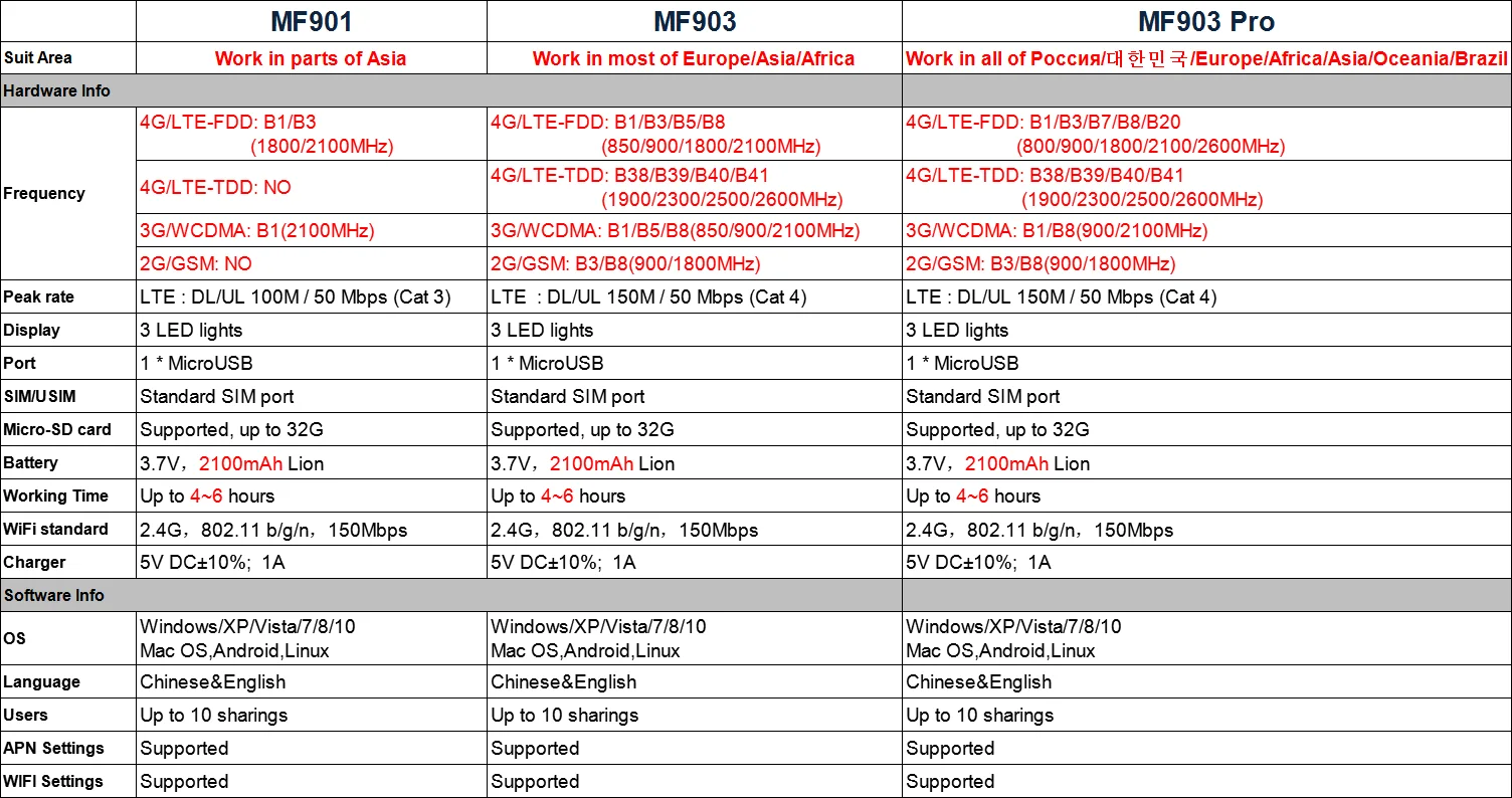 Набор микросхем Qualcomm поддерживает глобальную сеть TDD-LTE/ FDD-LTE/ UMTS LTE CAT4 до 150 Мбит/с до 10 Wi-Fi подключений одновременно. Низкое энергопотребление, батарея длится 4 ~ 6 часов, поддерживает sd-карту (до 32 Гб) и Wi-Fi обмен файлами 3 трехцветных светодиодный индикатор, рабочий статус отображается четко стильно и портативно