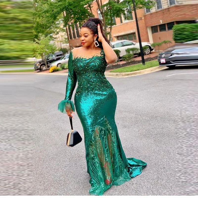 Зеленое вечернее платье с блестками и юбкой годе, с прозрачным вырезом, аппликацией из бисера, вечерние платья, женское платье для выпускного вечера с длинным рукавом Aso Ebi