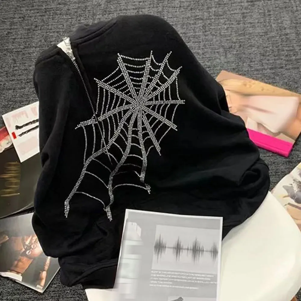 Толстовка Стразы в готическом стиле на молнии с изображением паутин...