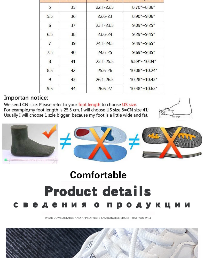 1. Пожалуйста, сначала Измерьте длину вашей стопы линейкой, когда вы выбираете размер. 2. Номер, указанный на подошве обуви,-это китайский размер, а не европейский размер! 3. Длина стопы-это не длина стельки, длина стельки составляет 0,5 см-1 см больше, чем длина стопы! Если вы имеете какие-либо проблемы, в таком случае, пожалуйста, свяжитесь с нами во-первых. Длина стопы 22,5 см = Китайский размер 35 = размер 35 (ЕС) = 5 (США) длина стопы 23 см = Китайский размер 36 = Eur 35,5 = US 5,5 длину стопы 23,5 см = Китайский размер 37 = Eur 36 = 6 (США) длина стопы 24 см = Китайский размер 38 = Eur 37,5 = Размер 7 (США) длина стопы 24,5 см = Китайский размер 39 = европейский размер 38 = US 7,5 длина стопы 25 см = Китайский размер 40 = Eur 39 = US 8,5