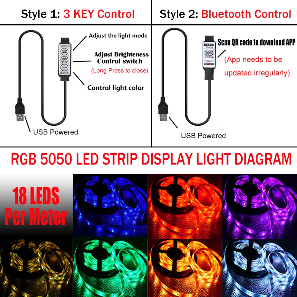 Светодиодная лента RGB 5050 с управлением через приложение и Bluetooth, 5 В, USB, гибкая декоративная подсветка для комнаты, телевизора, ПК, белая светодиодная лента