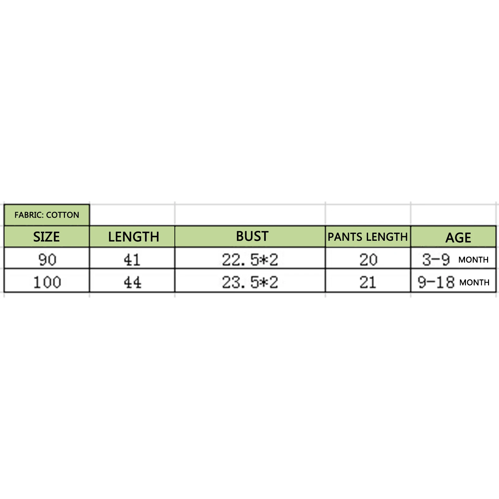 100 Длина топа: 17,32 Обхват груди: 22,44 Длина брюк: 8,27 возраст: 9-18 месяцев