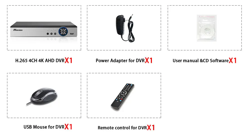 1 х H.265 4CH 4K 6 в 1 AHD DVR гибридный цифровой видеорегистратор;1 x Блок питания для DVR;1 X USB мышь для DVR;1 компакт-диск программного обеспечения для DVR;1 пульт дистанционного управления для DVR;