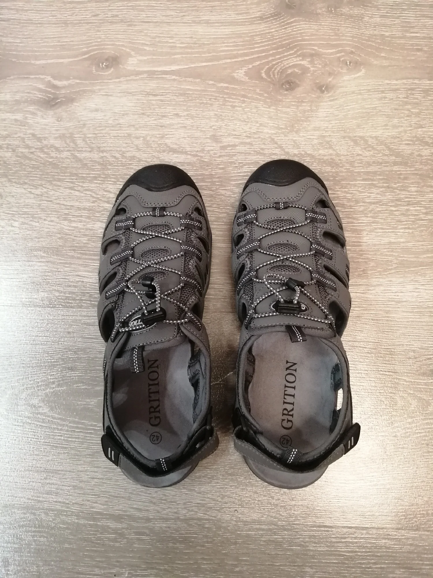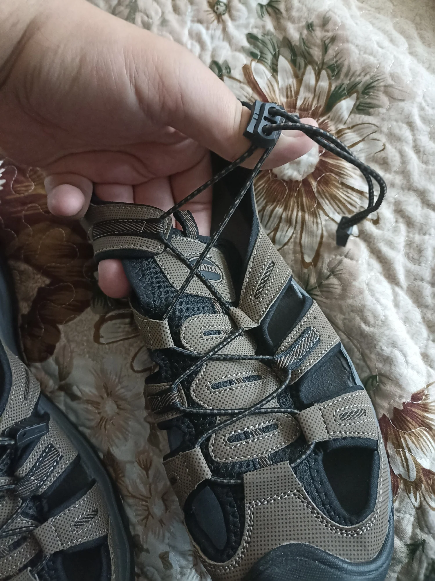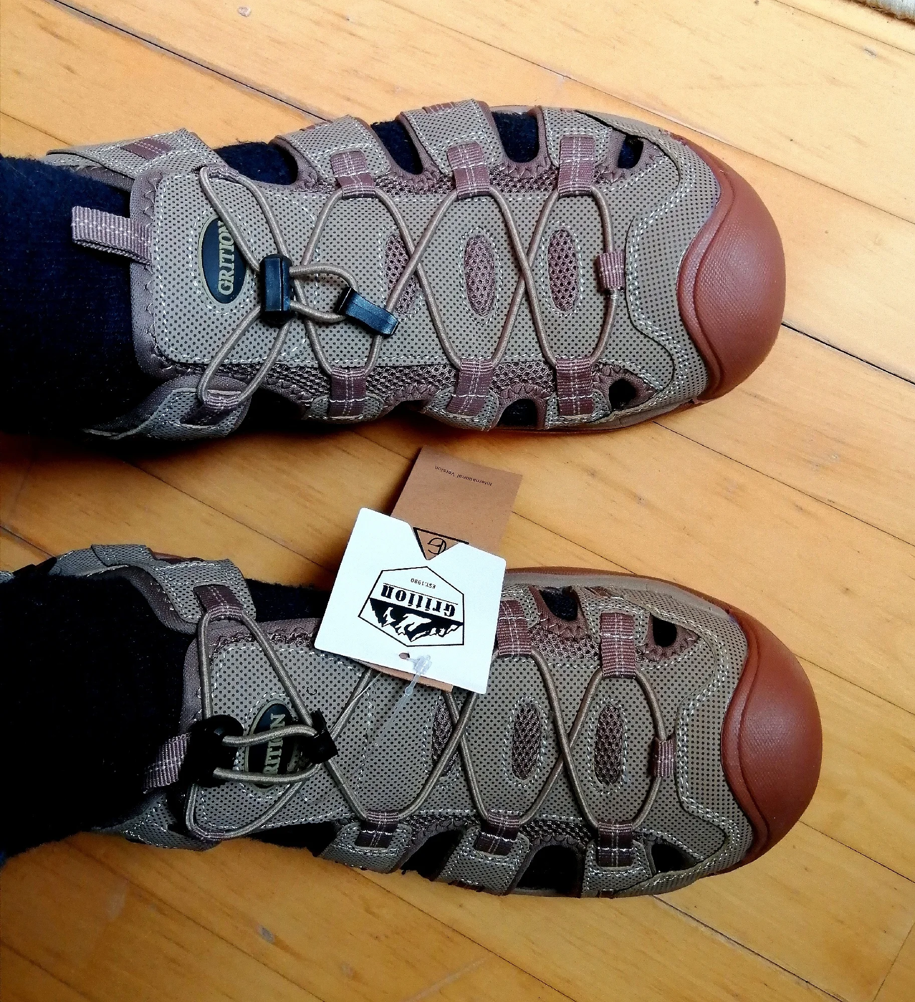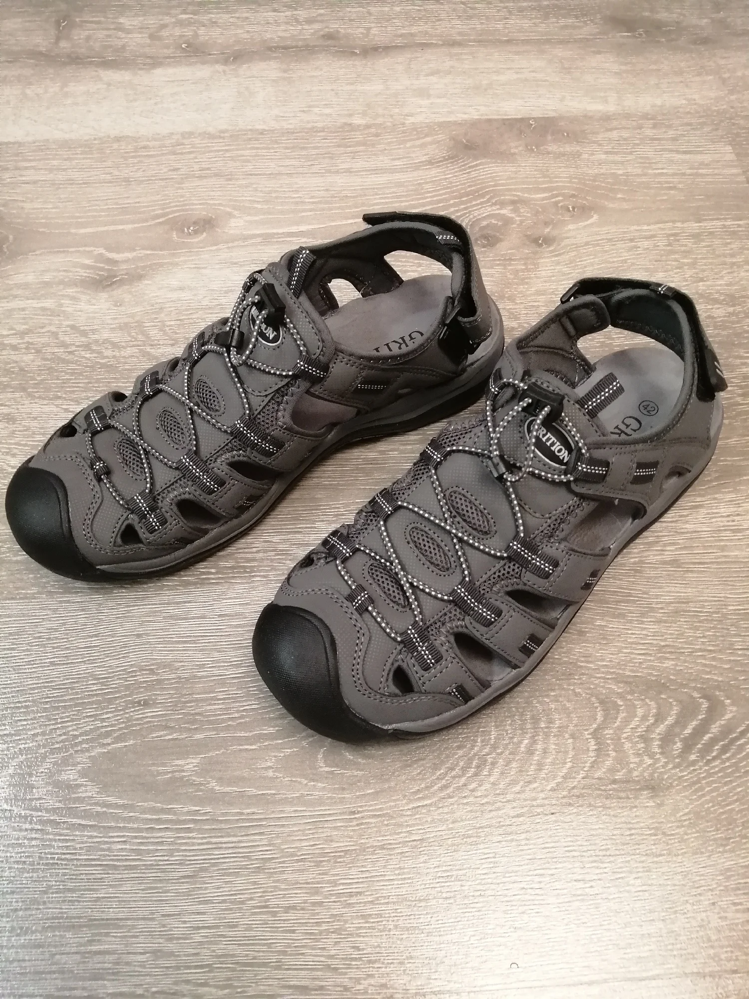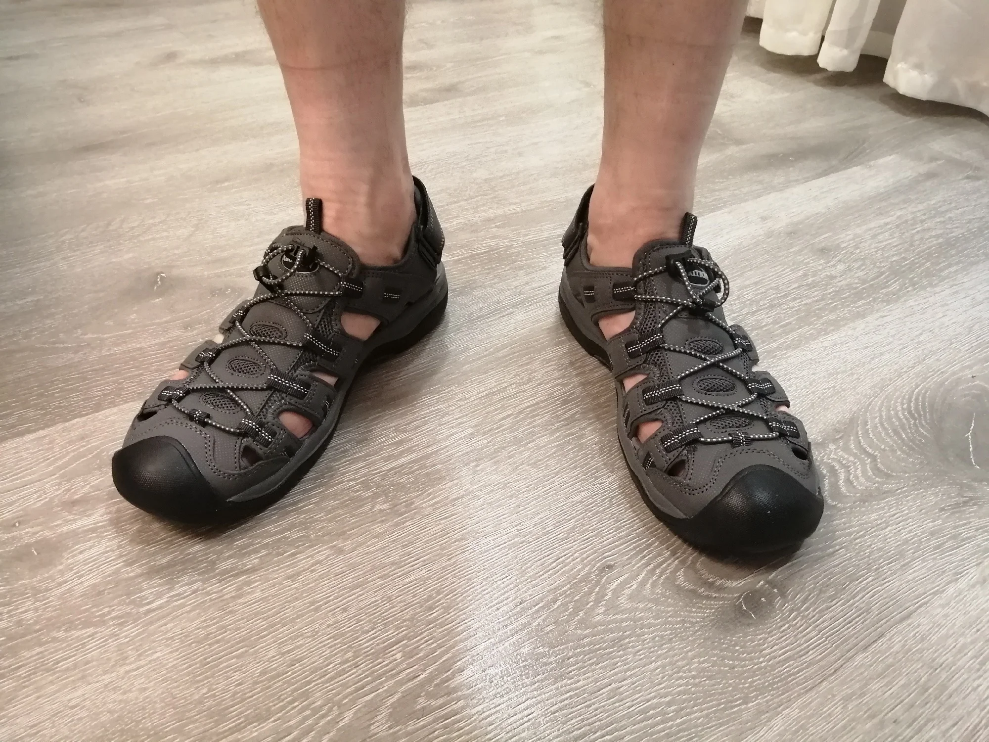 До СПб за 2 недели, получал в постамате. Сандали сделаны не плохо для своего стиля - типа на природу, ничего не торчит, клеем не испачканы. Запах был, но выветрился. Сверху кожзам и ткань, шнуровка резиновая, петельки для шнуровки из жесткой ткани. На подошве снизу жесткая резина, сверху резина помягче, стелька обтянута тканью и вклеена, в целом комфортно. Одеть и снять можно не отлепляя липучку, за счет растягивания шнурка, удобно. Брал, чтоб ходить на работу в жару. Первый раз беру обувь на Али, по этому с размером не понял. Обычно ношу 43. Длина стопы от стенки до кончика пальца примерно 27.6см. Взял 43, немного большемерят, буквально на пол размера. Если запихать ногу вперед, чтоб палец касался носка, то за пяткой еще останется почти 1см. Но у меня довольно высокий подъем. Так что пятка сама выезжает назад. Короче, размер надо брать свой, или на один меньше. На видео у продавца за пяткой очень много места остается.