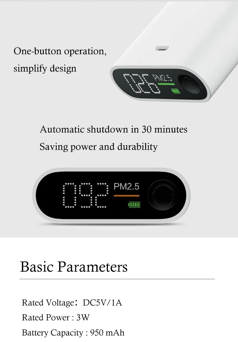 Особенности: 1. Зеленый, оранжевый, красный, трехцветный цифровой индикатор. Когда горит зеленый светильник, качество воздуха превосходное; Когда горит оранжевый светильник, это указывает на мягкое загрязнение воздуха; Когда горит красный светильник, это указывает на сильное загрязнение воздуха. 2. Автоматическое отключение через 30 минут, экономия энергии и долговечность 3. Высокоточный лазерный датчик. 4. Точное обнаружение в реальном времени 5. Долгий режим ожидания и HD дисплей 6.ABS материал, Отличное ощущение в руке, гладкая форма, небольшой и портативный 7.onebutton управление, упростить дизайн 8. Встроенный перезаряжаемый литиевый аккумулятор емкостью 950 мАч с низким энергопотреблением характеристики: Материал: АБС-пластик Номинальное напряжение: 5 В постоянного тока/1 А Номинальная мощность: 3 Вт Емкость аккумулятора: 950 мАч Примечание: это экологическая сеть продуктов Xiaomi (smartmi). На нем нет логотипа xiaomi. Посылка входит: 1 * изображения детектора Xiaomi Smartmi PM2.5: