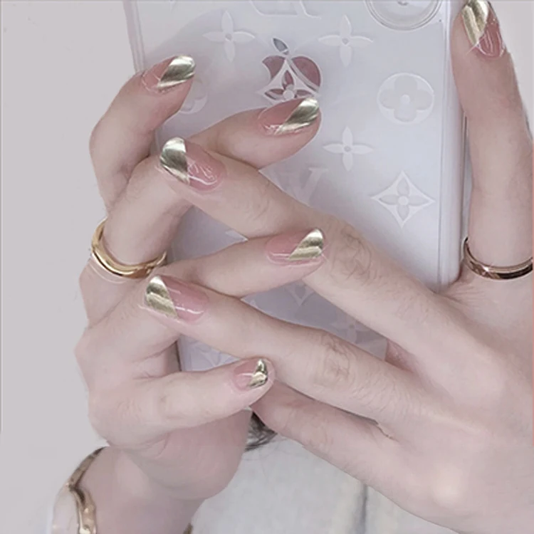 Французские Современные стильные элегантные накладные ногти с золотистыми и серебристыми краями