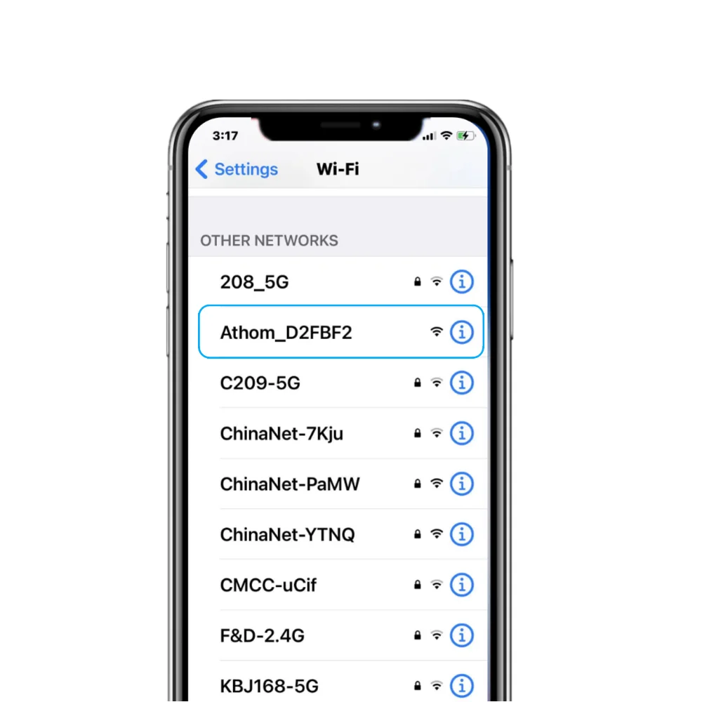 Используйте свой телефон или компьютер для поиска беспроводной связи, пока не найдете SSID с именем: Athom_xxxxxx ( xxxxxx будет mac-адрес вашей вилки)Затем подключите его