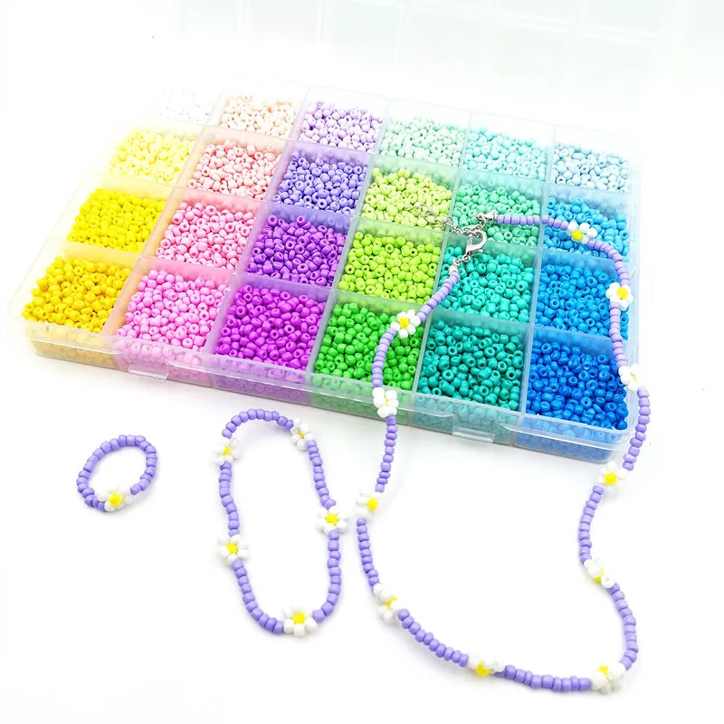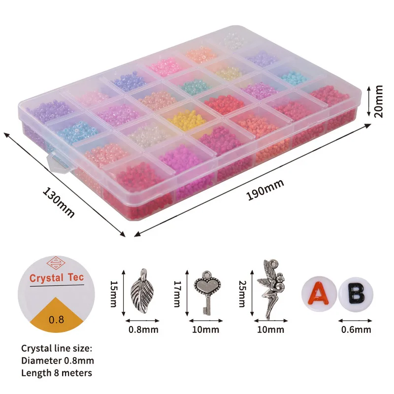 Набор из 24 цветных бусинВ том числе:24 цвета 12000 шт 3 мм бисер + аксессуарыСумка для аксессуаров4*7 мм буквы бусины 104 штA-Z каждой английской буквы/4 шт.Подвеска из сплава, 6 шт.Застежка-лобстер 20 шт.100 шт открытая петля2 рулона струны1 шт. ножницы