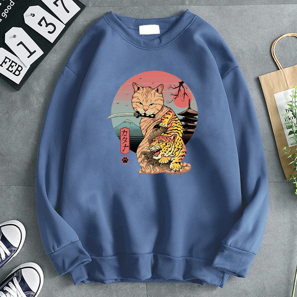 Худи Ukiyoe женское с мультяшным принтом кота, повседневный Свободный свитшот с круглым вырезом, уличная одежда в стиле Харадзюку, с капюшоном