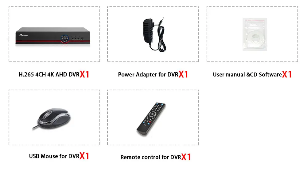 1 х H.265 4CH 4K 6 в 1 AHD DVR гибридный цифровой видеорегистратор;1 x Блок питания для DVR;1 X USB мышь для DVR;1 компакт-диск программного обеспечения для DVR;1 пульт дистанционного управления для DVR;