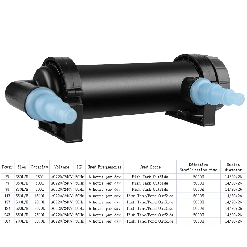 Мощность: 5 Вт (35 ~ 60 галлонов) 7 Вт (40 ~ 75 галлонов) 9 Вт (45 ~ 150 галлонов)