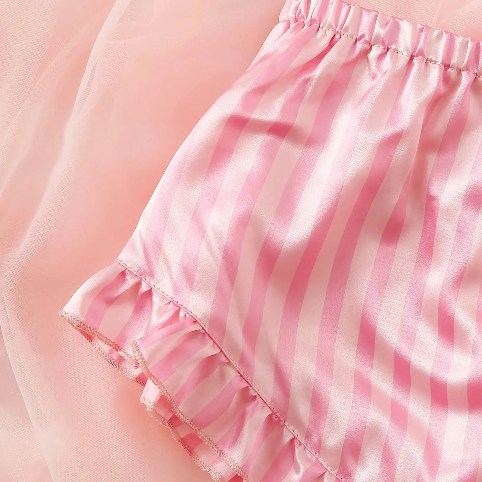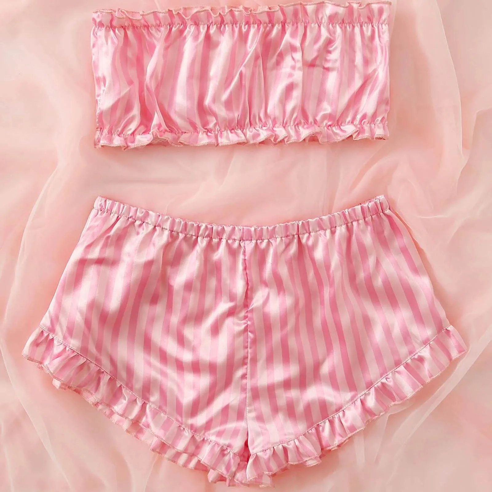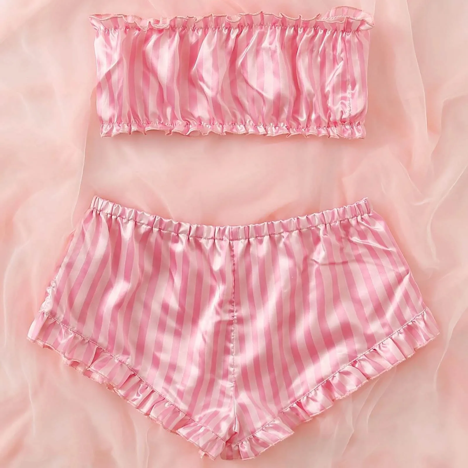 Пижамный комплект Женский атласный в розовую полоску, модная пикантная кружевная одежда для сна, соблазнительное нижнее белье