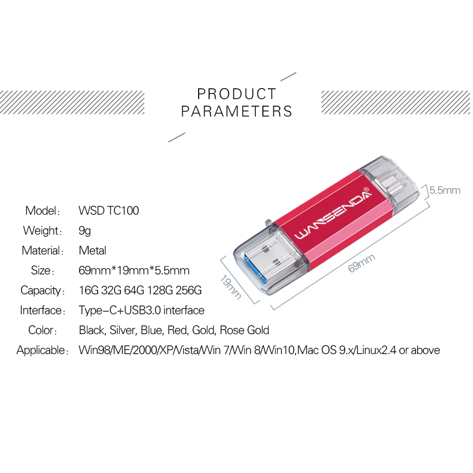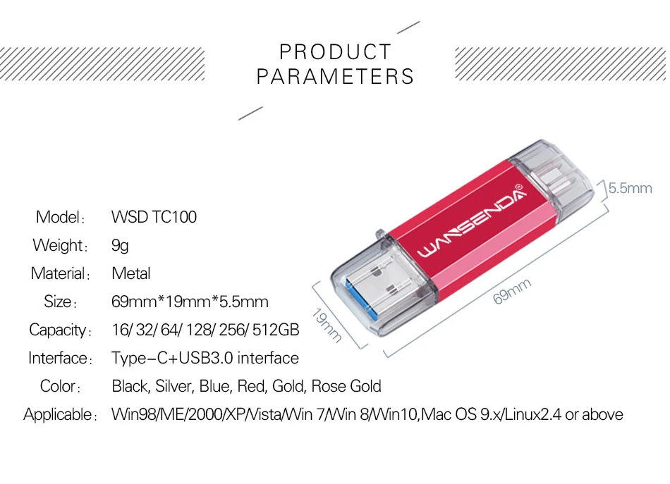 1. Срок службы:>1 миллион раз2. Рабочая температура: 0 ~ 60 C3. Вес нетто: 9 г4. Емкость: 16 Гб/32 ГБ/64 Гб/128 ГБ/256 ГБ/512 ГБ.5. Цвета: черный, красный, серебряный, золотой, синий, розовое золото.6. Требования к оборудованию: ПК с USB-соединением, ноутбук, MAC. Устройства Android (совместимы с 96% устройствами Android на рынке)7 посылка: 1 * ручка (с оригинальной розничной посылка вкой)