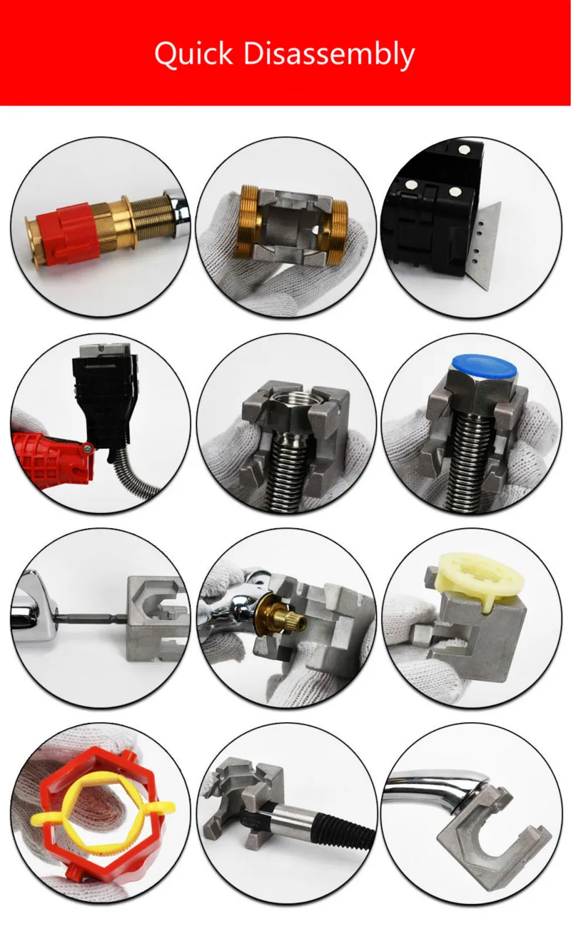 1. Установщик смесителя подходит для подачи гаек, запорных клапанов, сетчатых Корзин, соединительных гаек, гаек смесителя. Открытый слот обеспечивает легкий доступ к существующим линиям подачи, таким как краны, раковина, трубы водонагревателя, водные бассейны и так далее.