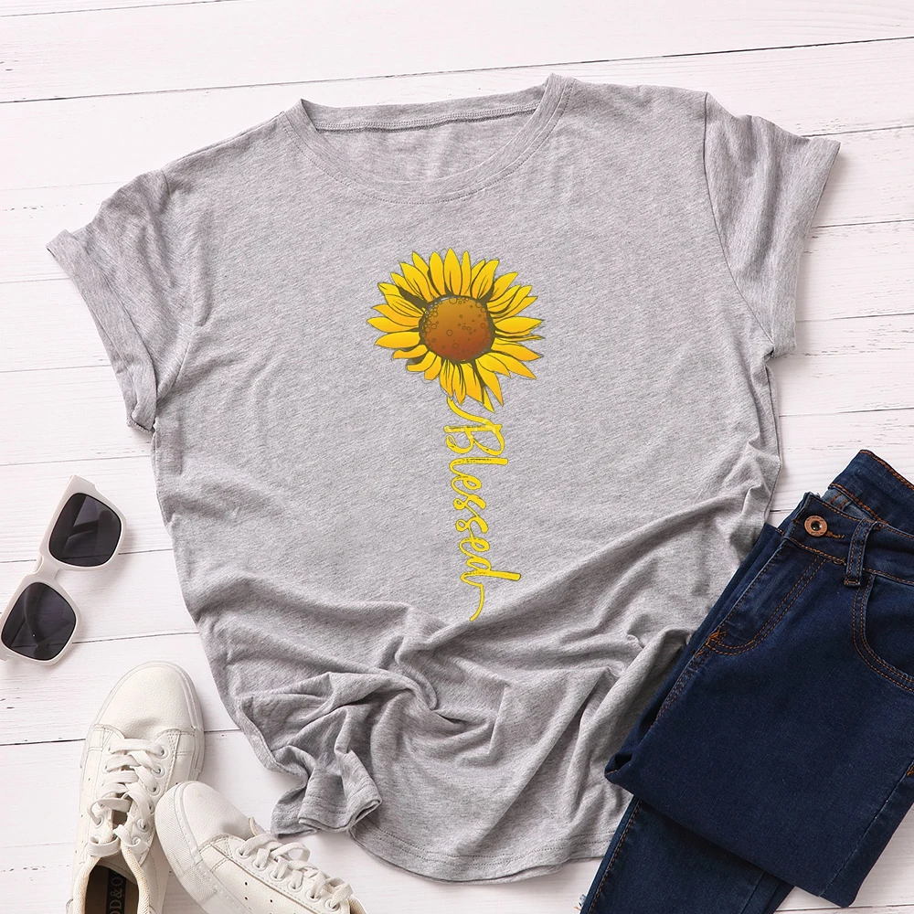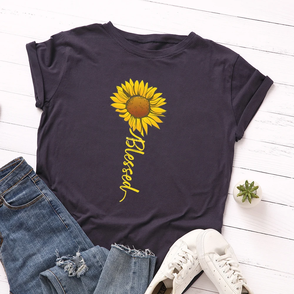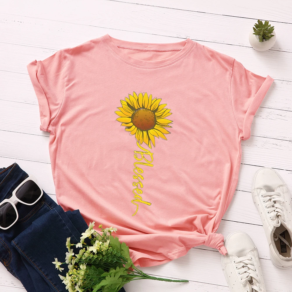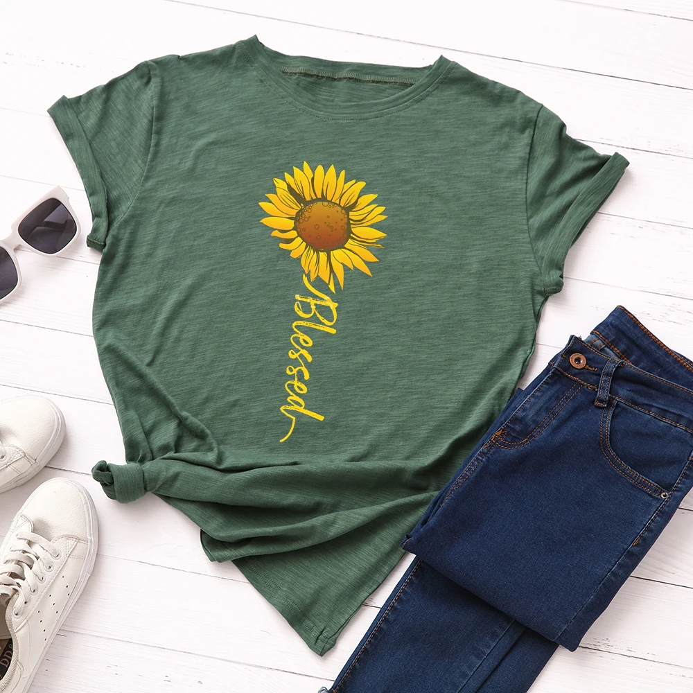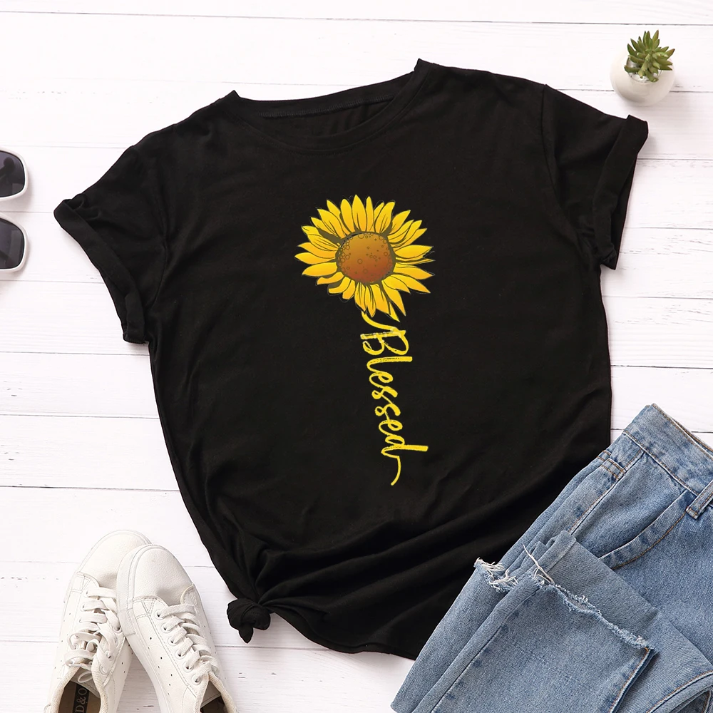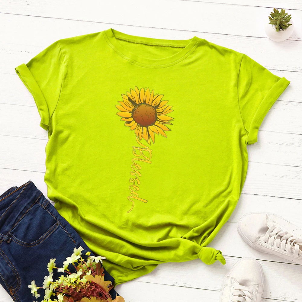 Женские хлопковые футболки с коротким рукавом, летние футболки с графическим рисунком, топы для женщин, повседневная одежда большого размера, топ с принтом подсолнухов, рубашка
