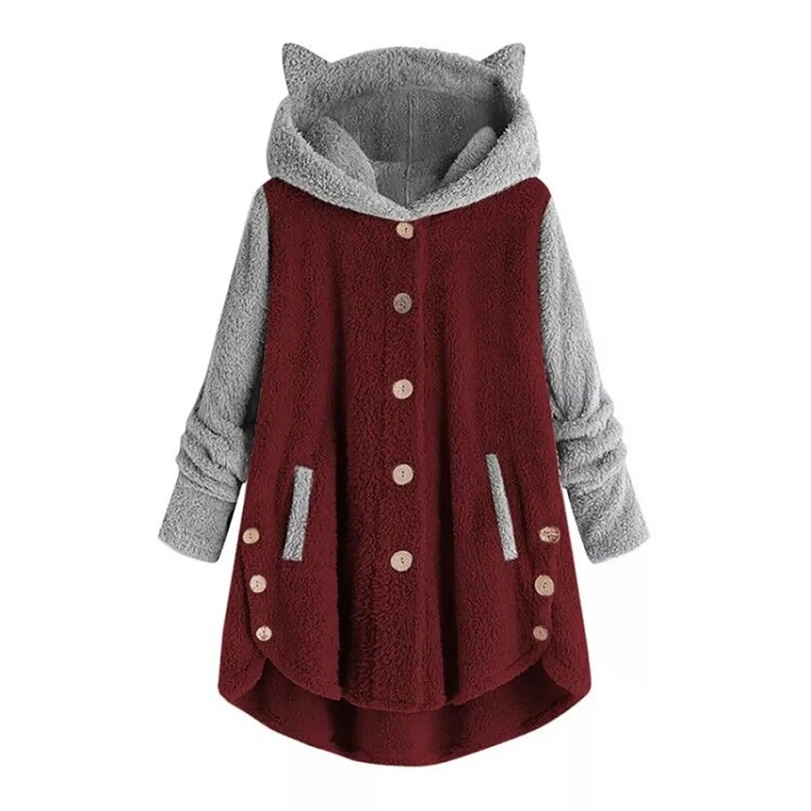 Осенне-зимняя теплая куртка с капюшоном, женское модное пальто на пуговицах с капюшоном и кошачьими ушками, плюшевое Асимметричное пальто с карманами