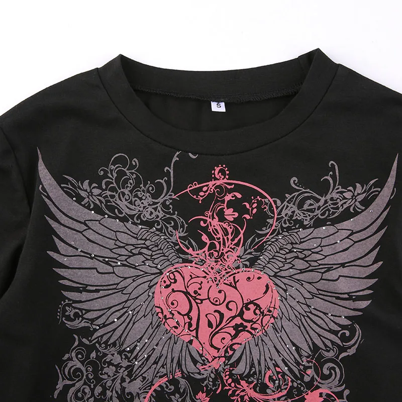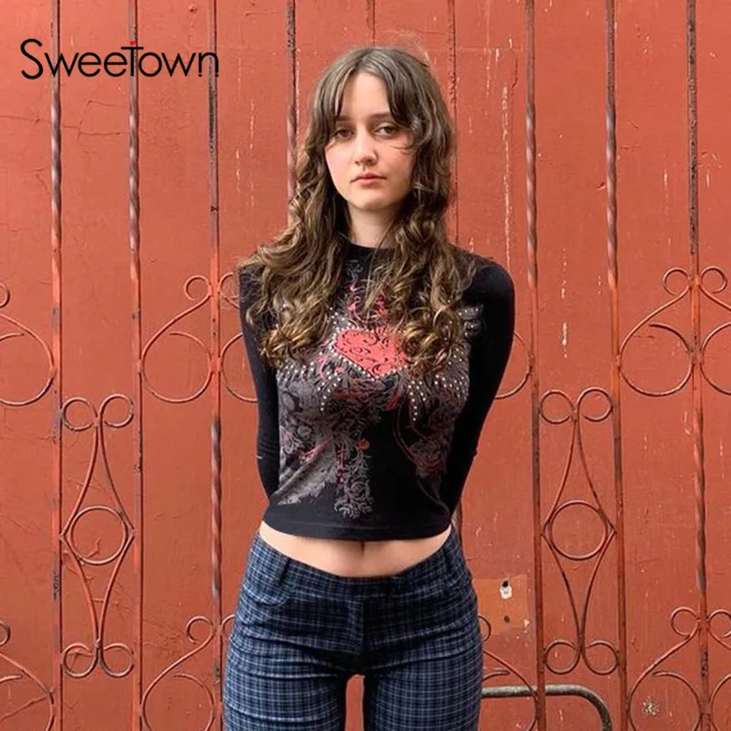 Женские черные футболки с рисунком сердца Sweetown Goth, милые футболки с графическим принтом для девочек, новые модные облегающие Осенние Топы с длинным рукавом