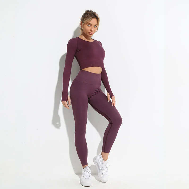 Бесшовный спортивный костюм, однотонный комплект для йоги, женская одежда для тренировок, одежда для фитнеса, короткий топ с длинным рукавом, леггинсы с высокой талией, одежда для спортзала