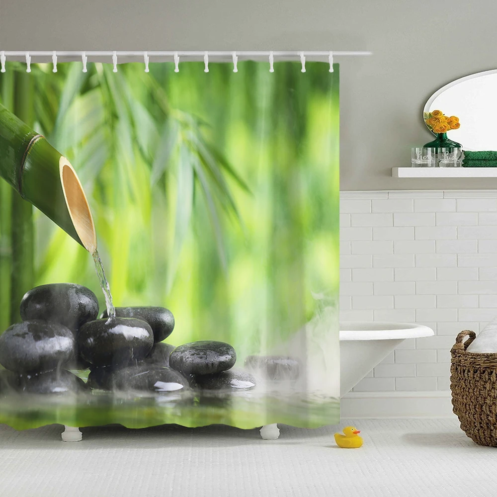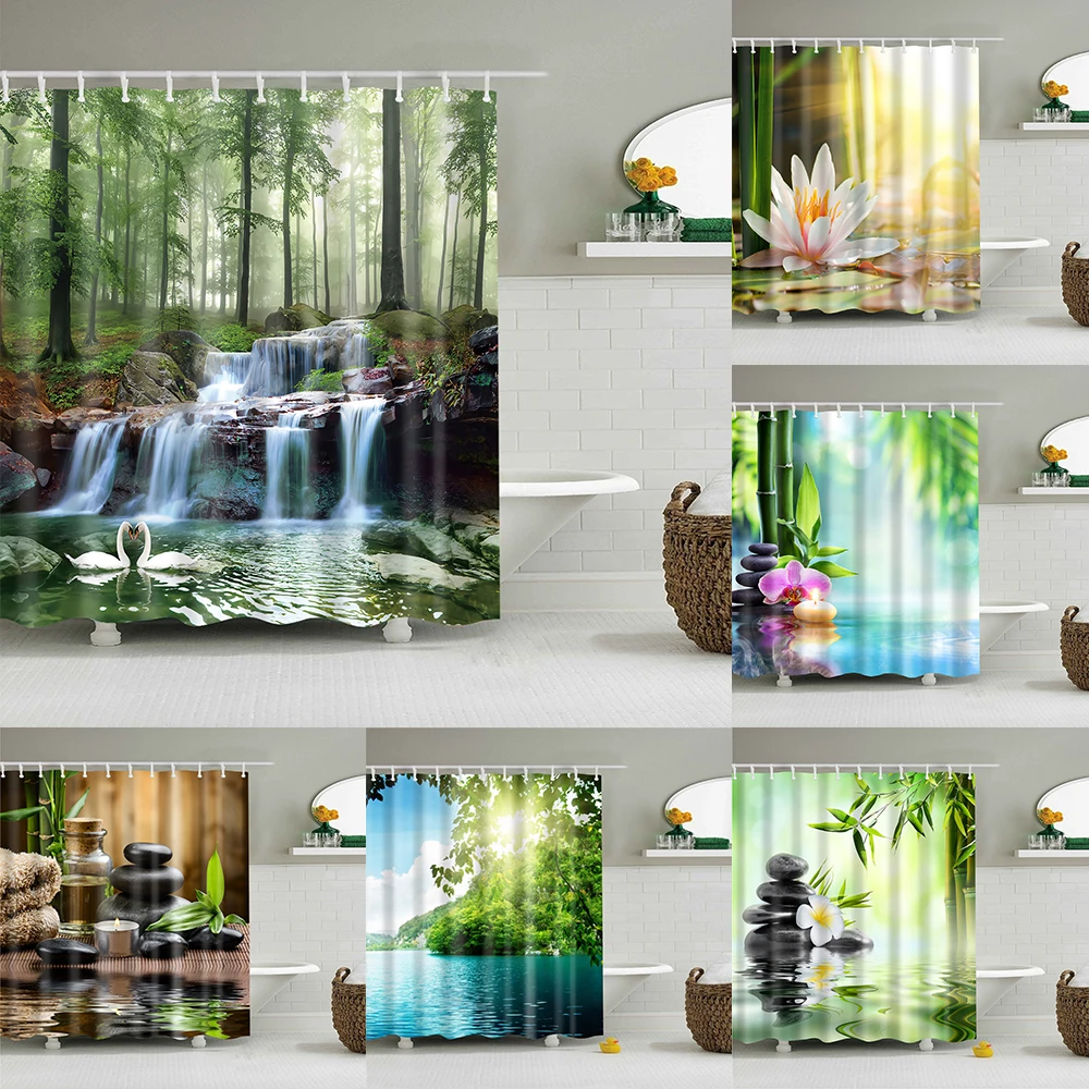 Набор тканевых занавесок для ванны, душа, из бамбука, горы, реки, пейзаж, Цветочный декор, полиэстер, водонепроницаемая ткань с крючками