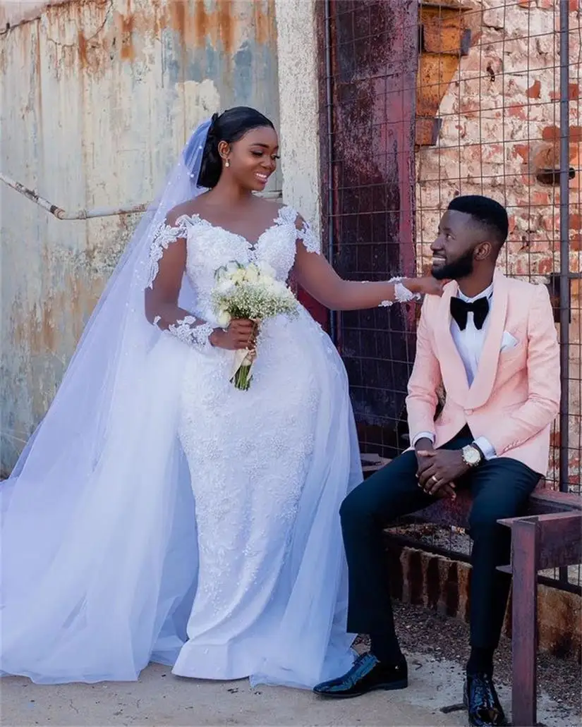 Белое жемчужное свадебное платье Русалка с длинным рукавом драгоценный вырез Иллюзия нарукавники Свадебные платья кружевные Африканские свадебные платья