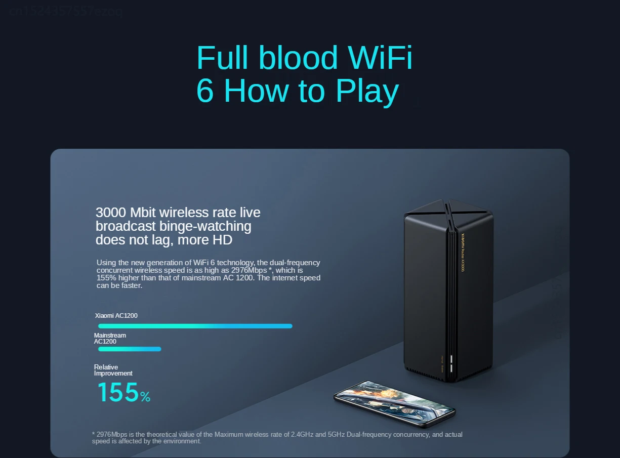 Используя технологию Wi-Fi 6 нового поколения, Двухдиапазонная Беспроводная скорость составляет до 2976 Мбит/с, что на 155% выше, чем основной AC1200, а скорость Интернета еще быстрее.