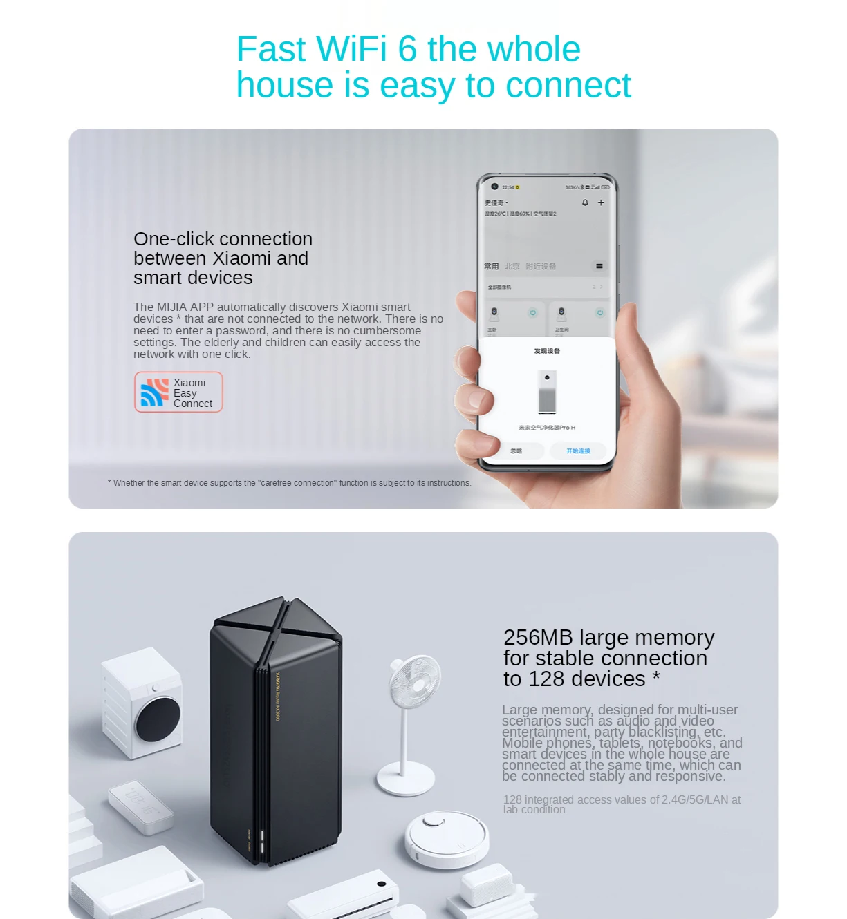 Интеллектуальное устройство с одним щелчком мышиПриложение Mi Home автоматически обнаруживает смарт-устройства Xiaomi, которые не оснащены Интернетом. Нет необходимости вводить пароль, нет громоздких настроек, и пожилым людям и детям можно легко получить доступ к Интернету одним щелчком мыши.Большая память 256 МбСтабильное подключение к 128 устройствамБольшая память, специально подготовленная для многопользовательских сценариев, таких как аудиовизуальные развлечения и вечерние отключения. Мобильные телефоны, планшеты, ноутбуки и смарт-устройства во всем доме подключены одновременно, и они могут быть подключены к Интернету стабильно и отвечать плавно.