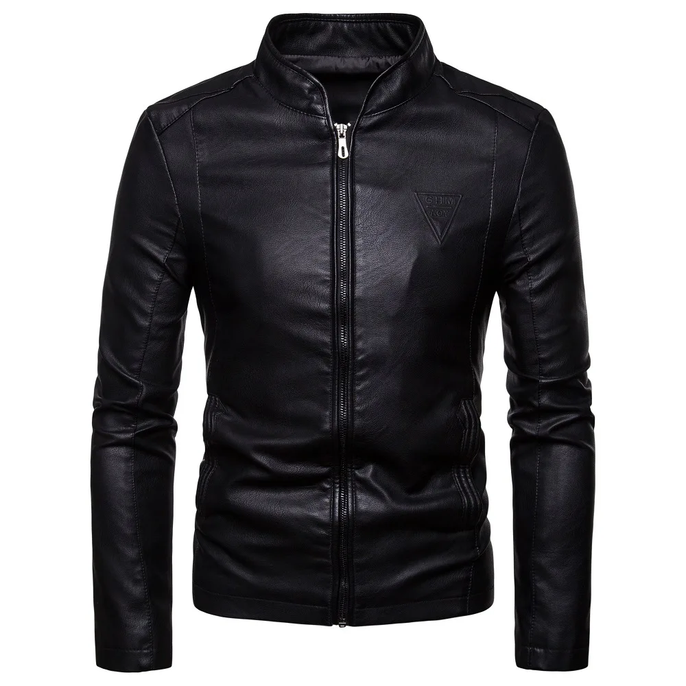 Мужская кожаная куртка с воротником-стойкой, Повседневная однотонна...
