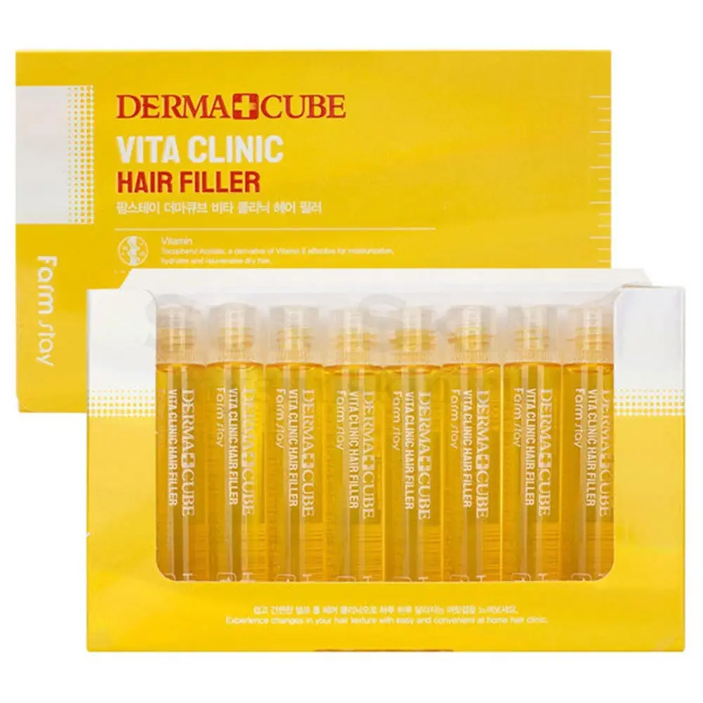 Витаминизирующий филлер для волос мгновенного действия FarmStay Derma Cube Vita Clinic Hair Filler значительно улучшает состояние волос всего за 10 минут.