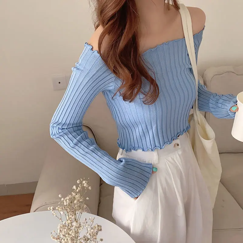 Футболка женская с длинным рукавом, элегантный пикантный однотонный универсальный топ с открытыми плечами, Повседневная Мягкая футболка в Корейском стиле, лето