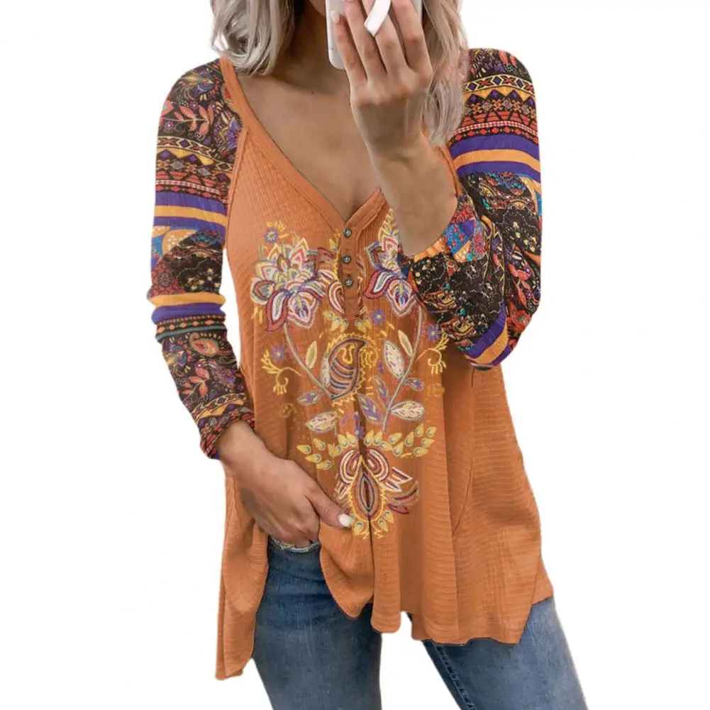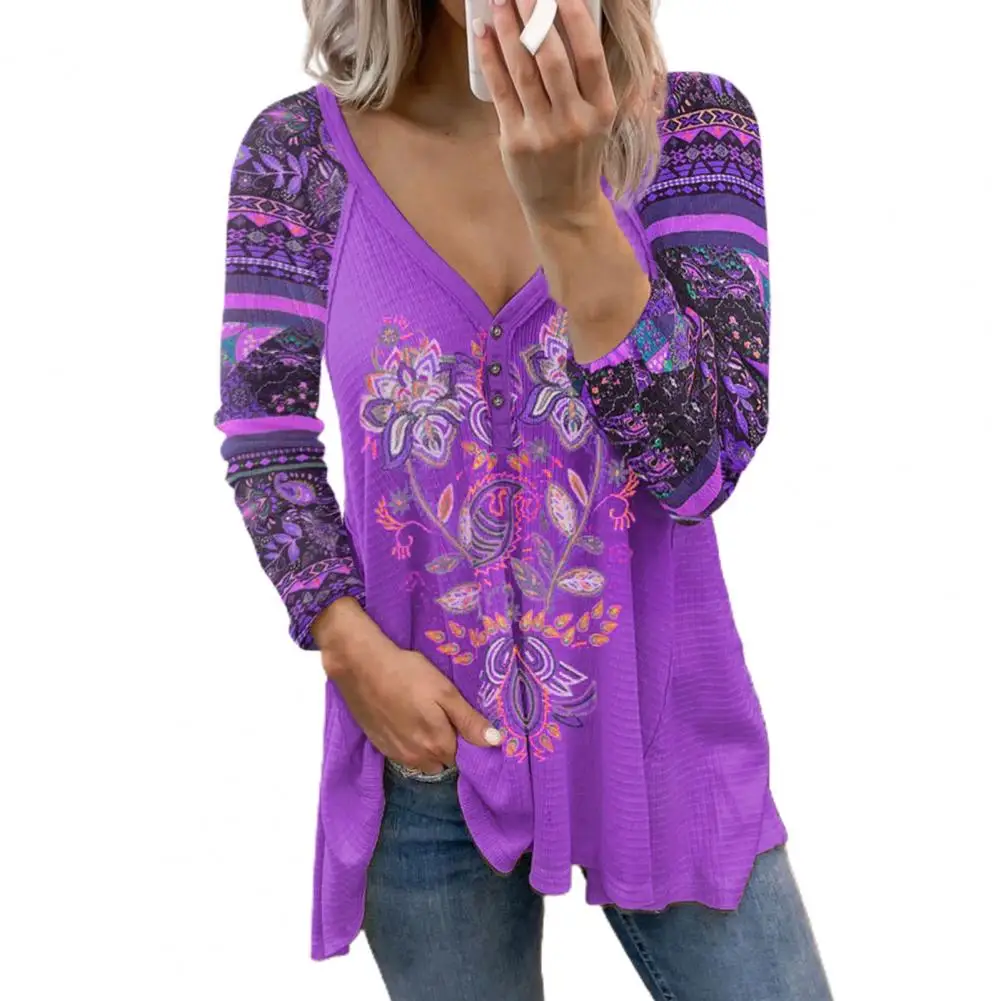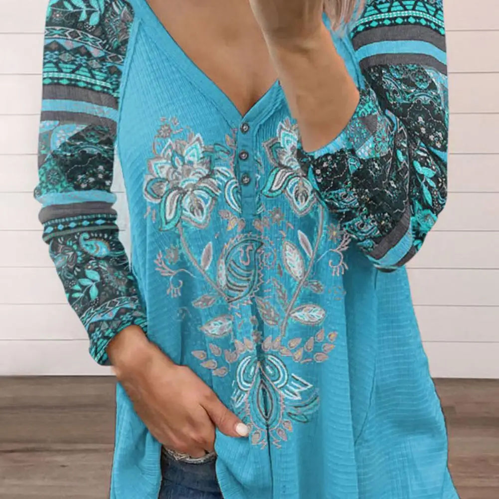 Женская блузка с длинным рукавом, V-образным вырезом и принтом