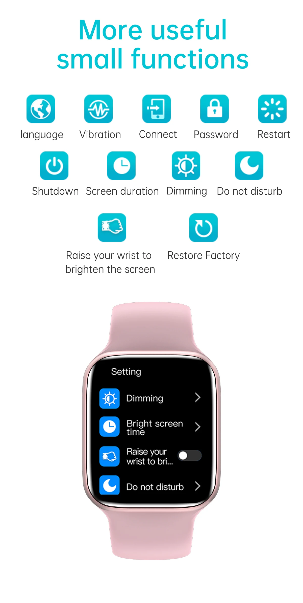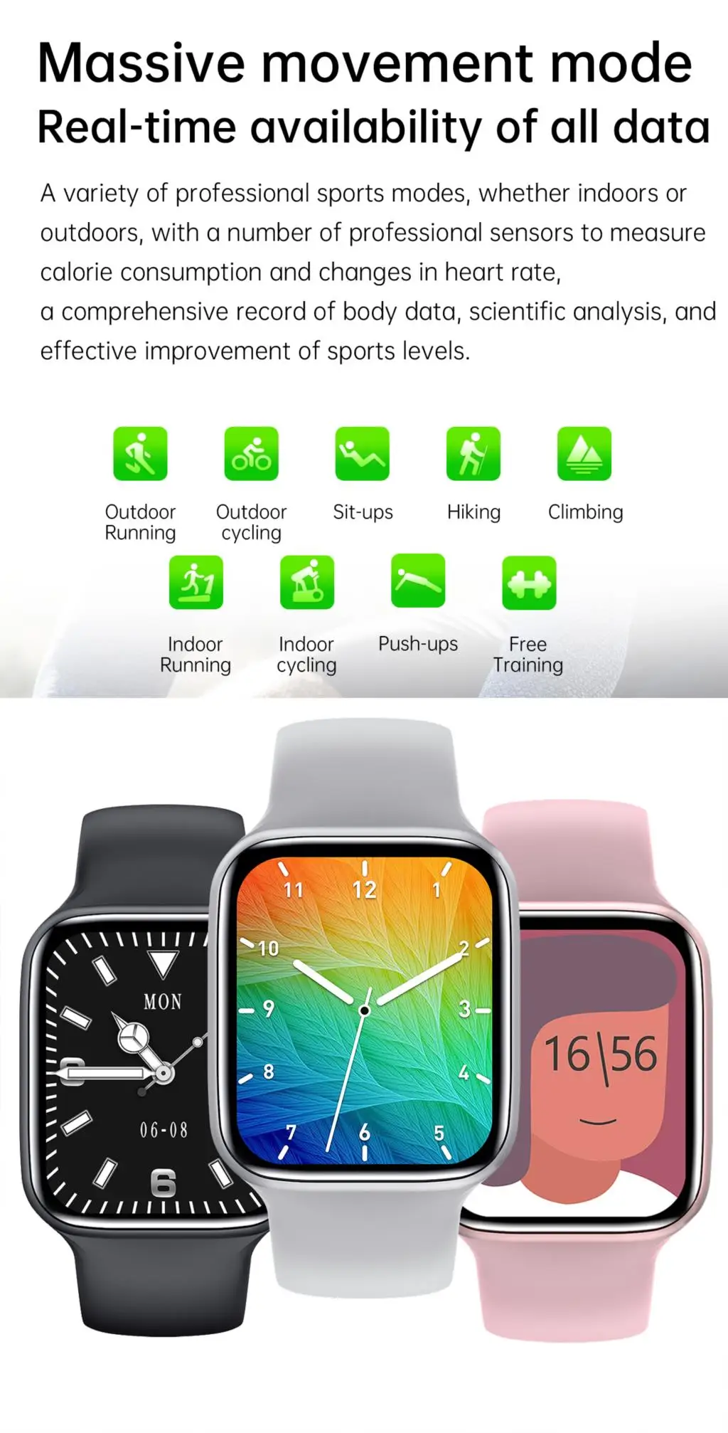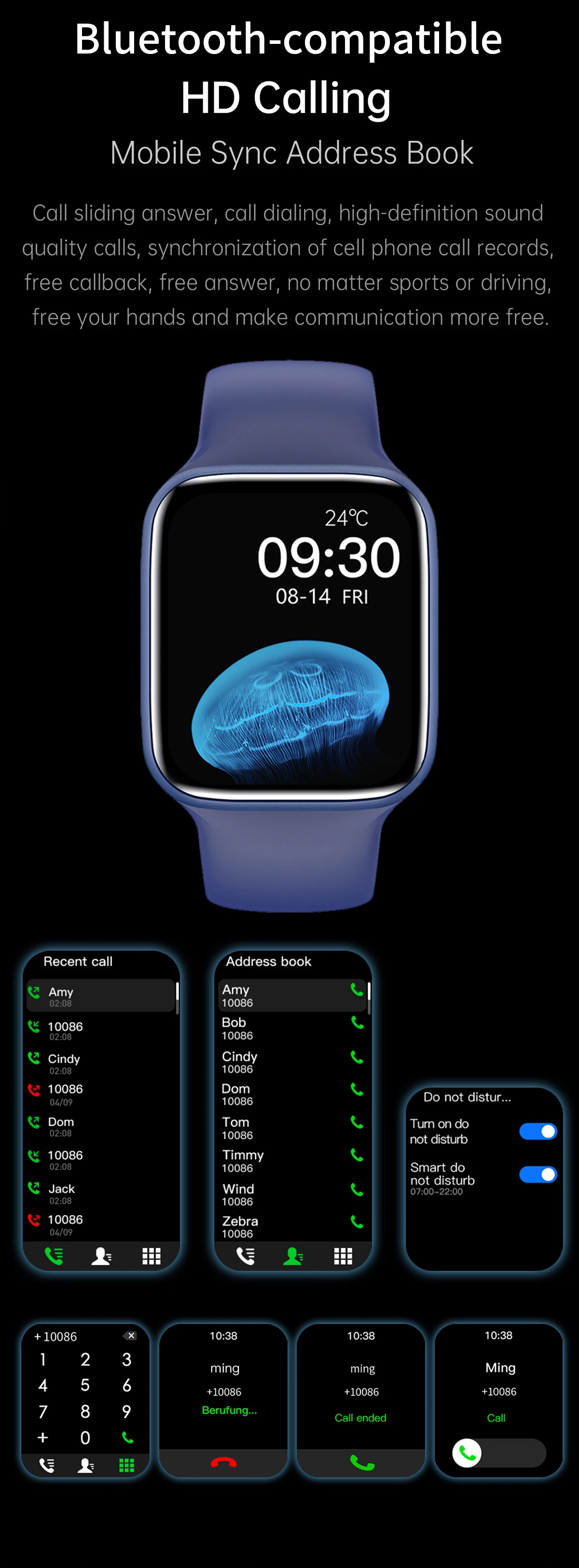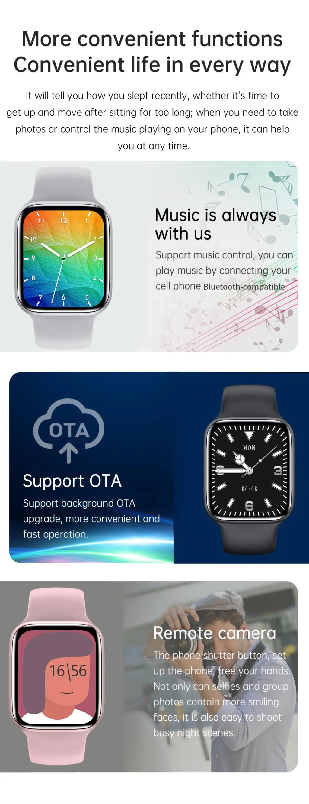 1. Следите за своим здоровьем:Пульс/кровяное давление/Монитор кислорода в крови, трекер сна, напоминание о малоподвижности.2. Хороший помощник для тренировки:Шагомер, мет, сожженные калории, расстояние, дыхательные упражнения, спортивные режимы.3. Хороший помощник для повседневной жизни:Bluetooth-совместимые телефонные звонки, синхронизация уведомлений, калькулятор, пользовательские лица, блокировка экрана пароль, часы лицо рынок, 3D динамические лица, погода, воспроизведение музыки, камера дистанционного управления, секундомер, анти-потеря, И т. д.
