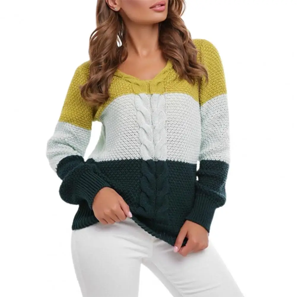 Трикотажный топ с V-образным вырезом, пуловер с длинным рукавом, вязаные джемперы с цветными вставками, Женский трикотажный свитер для повседневной носки