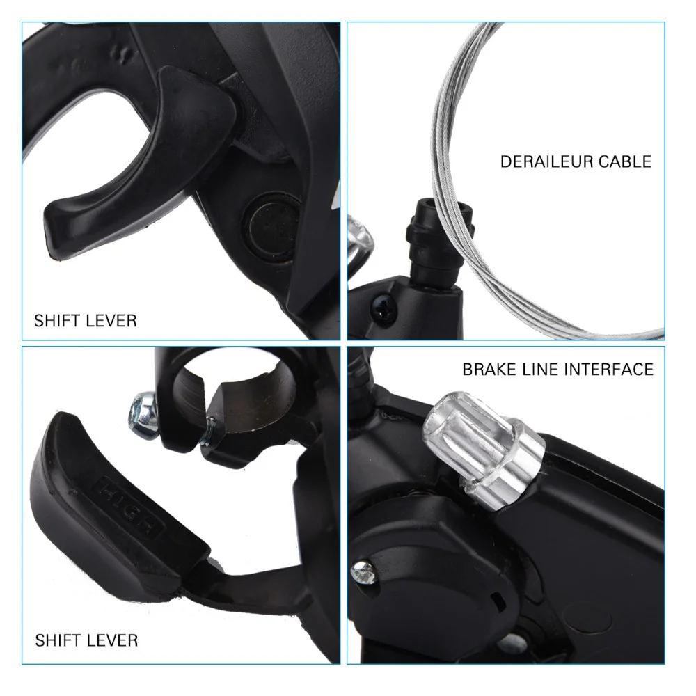 Особенности:1. Комбинация обеспечивает точное и последовательное смещение благодаря эргономичной форме рычага переключения/тормоза.Совместимость 2,3x7 скоростей3, эргономичный рычаг переключения передач/тормоза4. Шумоподавляющий бампер5. Видимый индикатор Отображения Оптической шестерни для сразу подтверждения положения шестерни с номером6. Совместим с гильзовыми, консольными, роликовыми и механическими дисковыми тормозами8. Все переключатели поставляются с проводамиПосылка:1 пара переключателей передач/тормозов