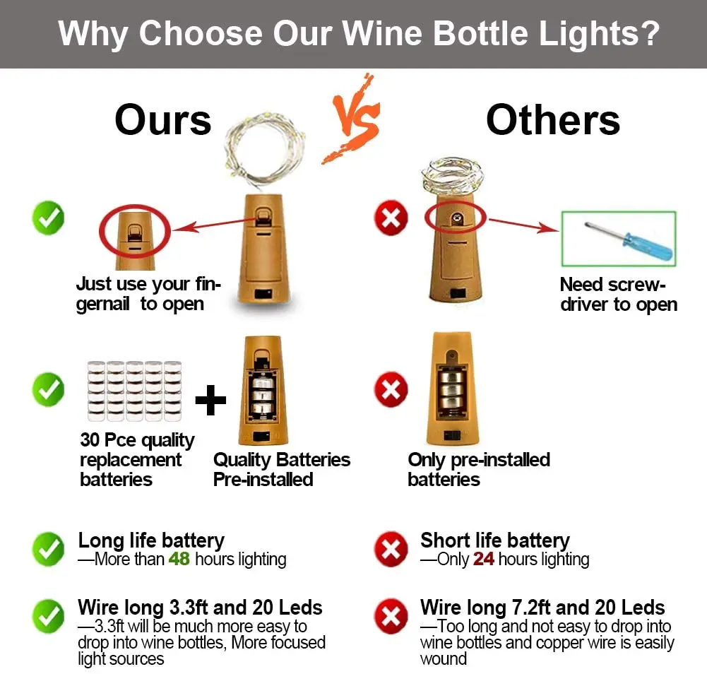 Эти лампы идеально подходят для бутылок, которые мы освещали в качестве свадебного декора. Пробки хорошо помещаются в бутылки, и освещение проходило всю свадьбу без каких-либо проблем. Красиво и ярко.