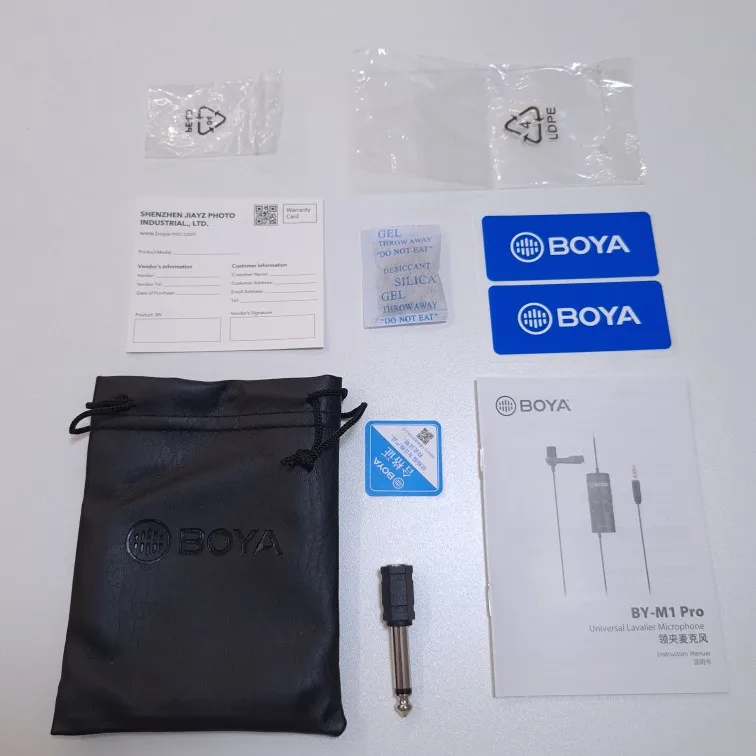 1 * BY-M1 Pro петличный микрофон1 * поролоновое ветровое стекло1 * зажим для одежды1 * Липучка1 * Аккумулятор (LR44)1 * чехол для переноски1 * Руководство пользователяОригинальная посылка от производителя
