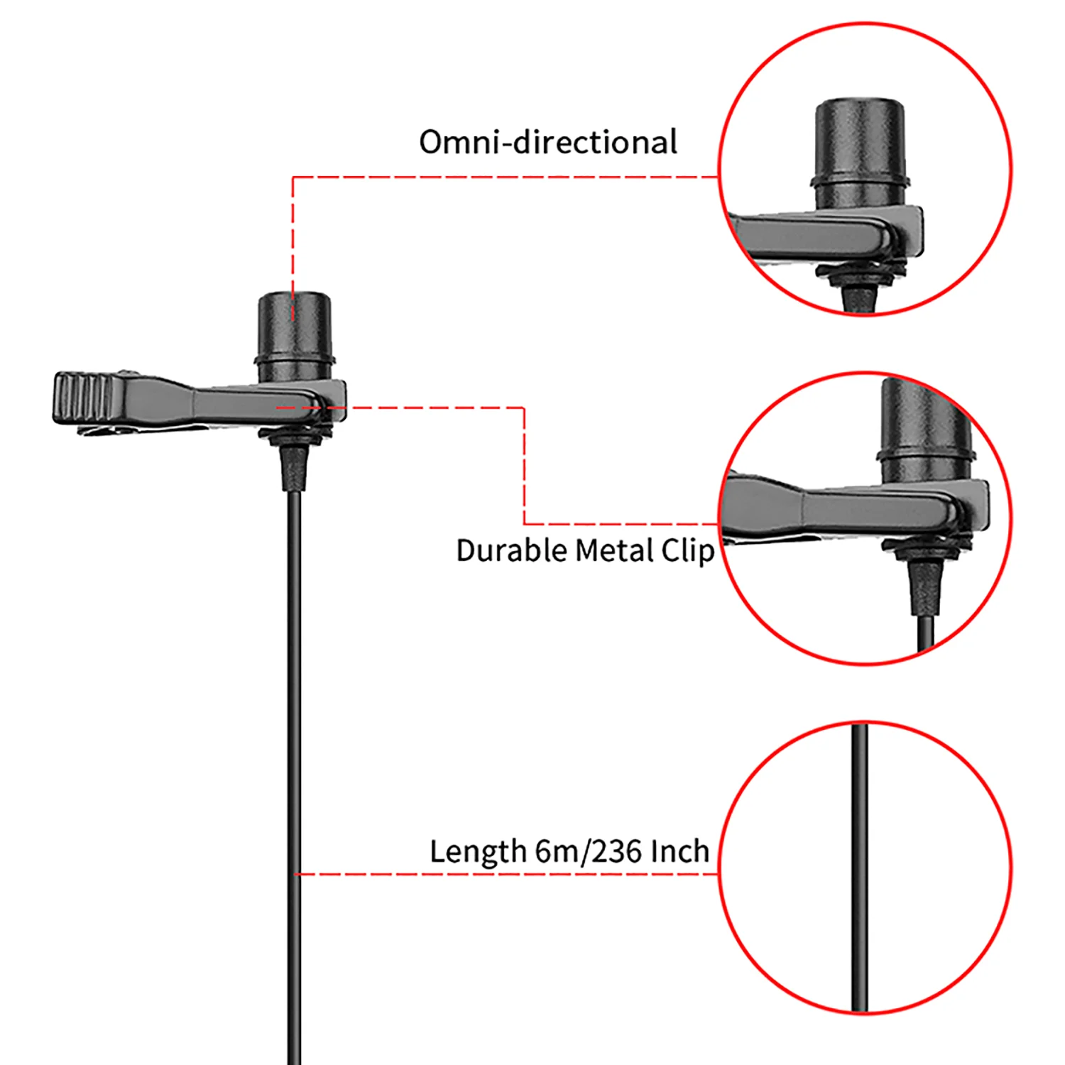 Клип на микрофон для iPhone 7 6 6s 6s plus 5 5s 4 4s, DSLR камеры, видеокамеры, аудио рекордеры, акустики и усилителяВсенаправленный конденсаторный микрофонВысококачественный конденсатор, идеально подходит для использования видеоНизкий уровень шума при обращенииВключает зажим для лацкана, батарею LR44, ветровое стекло пены, адаптер 1/4"
