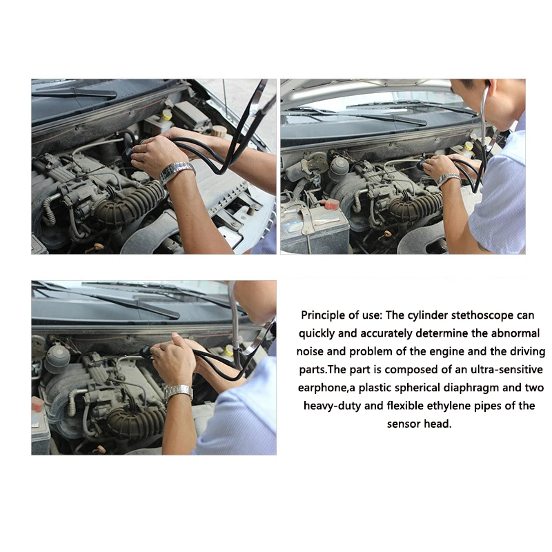 Принцип использования:Стетоскоп для автомобильных цилиндров может быстро и точно определить ненормальный шум и проблему двигателя и автозапчастей.Часть состоит из сверхчувствительных наушников, пластиковой сферической диафрагмы и двух сверхмощных и гибких этиленовых труб головки датчика. Характеристика:Металлический зонд простирается до 350 мм для попадания в замкнутые зоны;Изготовлен из нержавеющей стали, ударопрочного АБС-пластика и резины.Уникальная звуковая камера усиливает звук;Оснащен диафрагмой, позволяющей определить источник шума;Универсальный инструмент для всех автомобилей. Характеристики:Материал: резина, пластик и нержавеющая стальДлина зонда: около 300 мм Диаметр зонда: прибл. 3,3 ммВес: около 110 гЧастота обнаружения: 10 Гц-10 кГц Описание:1. Функция: идеально подходит для определения проблем автомобильного двигателя, определения сломанных прокладок, плохих шкивов, поврежденных шестерен, дефектных клапанов, неисправностей водяного насоса и других поврежденных частей, которые вызывают нечетные шумы и неисправные операции.2. Чувствительный Источник шума: имеет чувствительную звуковую камеру, которая усиливает звуки, так что вы можете легко обнаружить поврежденные части в двигателе.3. Простота в использовании: амбушюры инструмента позволяют игнорировать внешние шумы, чтобы вы могли фокусироваться на обнаружении проблемы.4. Легко найти проблемы: просто найти, где звук является самым громким и создать контакт между зондом и поверхностью для подтверждения.5. Противоударные ручки: ручки делают работу более безопасной. Удобные резиновые наушники идеально изолируют внешние шумы.6. Многофункциональный инструмент: Идеально подходит для передачи, чехол передачи, клапан, задняя ось и двигатель.