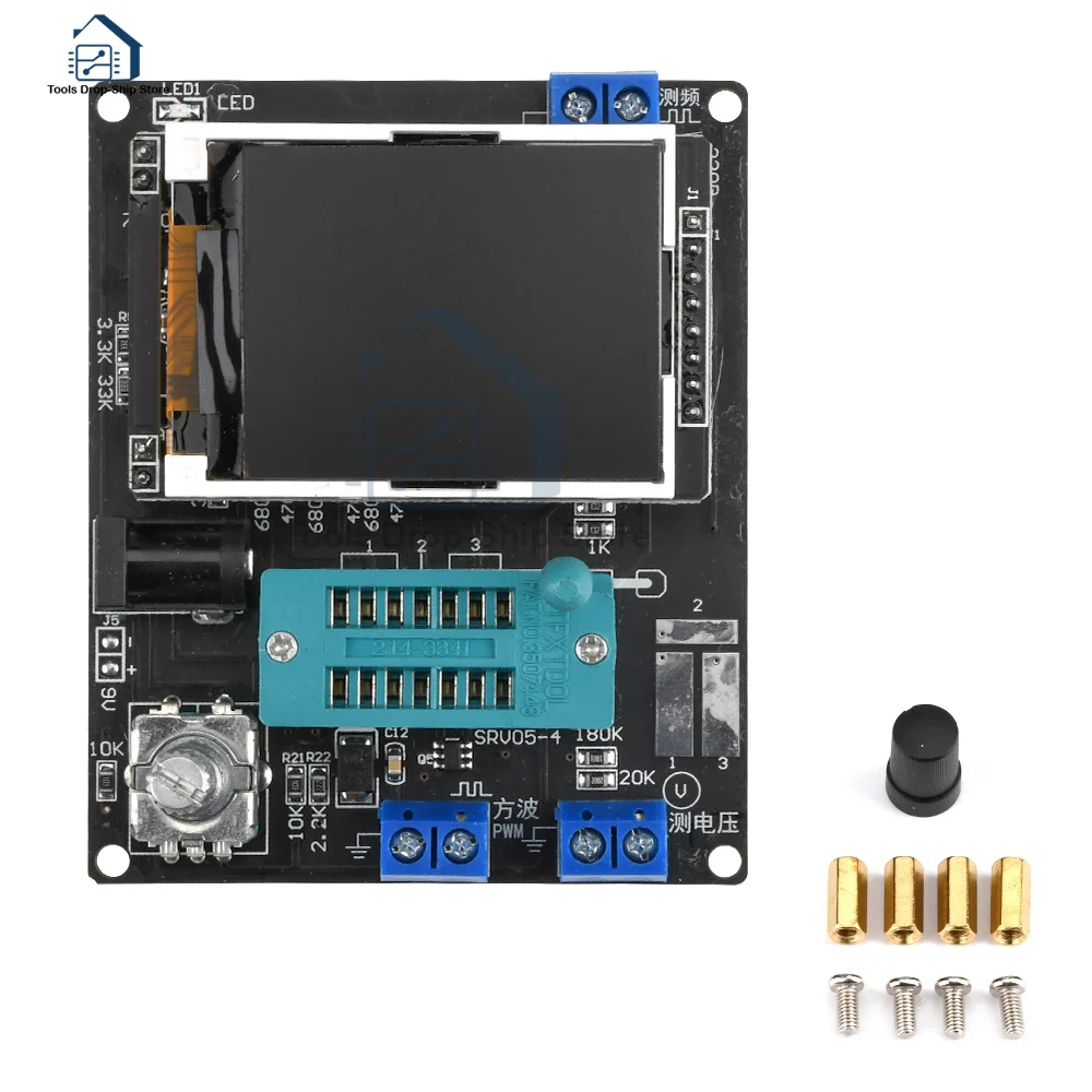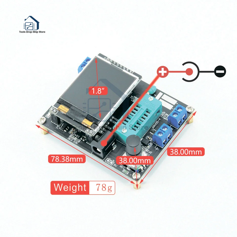 Описание:Многофункциональный тестер транзисторов для автоматического обнаружения NPN и PNP транзисторов, FET, диодов, двух диодов, тиристоров, SCR, автоматической идентификации транзисторов. Он также может использоваться в качестве сигнала прямоугольной и PWM генератор сигналов. Характеристика:Цифровой ЖК-дисплей для легкого чтения данных и графики.Управление поворотным переключателем.Основным чипом является DIP, легко для электронных энтузиастов DIY или обновление.Применение s аккумулятор 9 В (не входит в комплект) или Применение питания постоянного тока (DC 6,8-12V).Автоматическое выключение (ток выключения составляет около 20 на).Тест NPN и PNP транзистор общий эмиттер коэффициент усиления тока, основание-эмиттер пороговое напряжение, от коллектора-эмиттер ток утечки.Поддерживает 2 резистора измерения, показывает его положительное и отрицательное, на-состояние напряжения.Измерение сопротивления Максимальное разрешение 0.01Ω, может быть измерено до 50MΩ.Автоматическое тестирование контактов компонента и отображение на дисплее.Измерение порогового напряжения и емкости ворот FET.Для следующих 2100Ω резистор при измерении его индуктивности диапазон измерения от 0,01 mH 20 гн.Может использоваться в качестве генератора сигналов и частотного метра: Частотный диапазон от 1 Гц-2 МГц и может генерировать 1%-99% PWM (модуляция ширины импульса) сигналы. Примечание:Перед измерением емкости конденсатор должен быть разряжен, в противном случае он может повредить счетчик. Спецификация:Дисплей: 160x128 LCDМощность питания: аккумулятор 9 В (не входит в комплект), переменный ток 6,8-12VТок: приблизительно 30 мАИзмерение сопротивления: макс. 50 мОмРазрешение сопротивления: 0.01ΩИзмерение емкости: 25pF - 100mFРазрешение емкости: 1pFИзмерение напряжения постоянного тока: до 50 вЭкран Размер: 3,7 х 3 см (1,45x1,18 дюйма)Размер печатной платы: 7,8x6,2 см (3,1x2,44 дюйма)