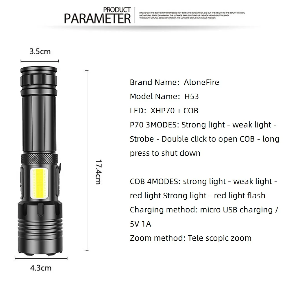 4. P70 3 режима: сильный светильник-слабый светильник-стробоскоп-двойной щелчок для открытия COB-Длительное нажатие для выключения