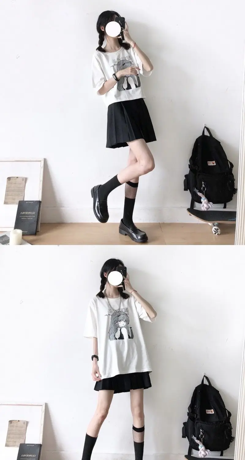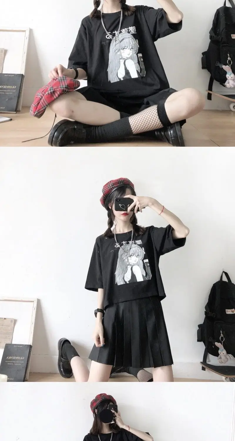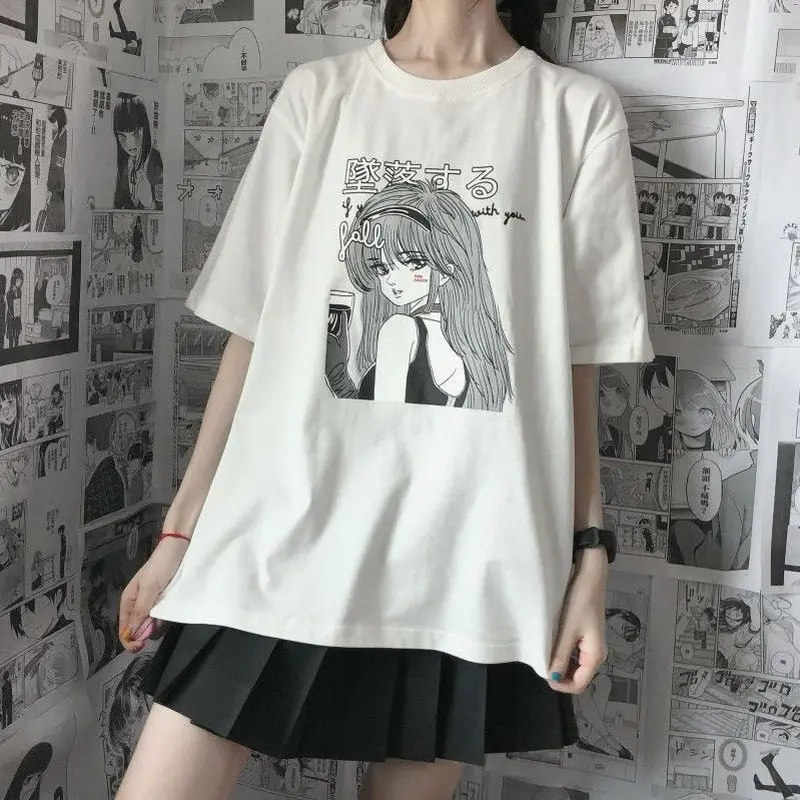 Футболка с коротким рукавом Новинка 2021 Студенческая Корейская свободная Летняя короткая рубашка в стиле Харадзюку мультяшная универсальная гранж-рубашка трендовая уличная одежда