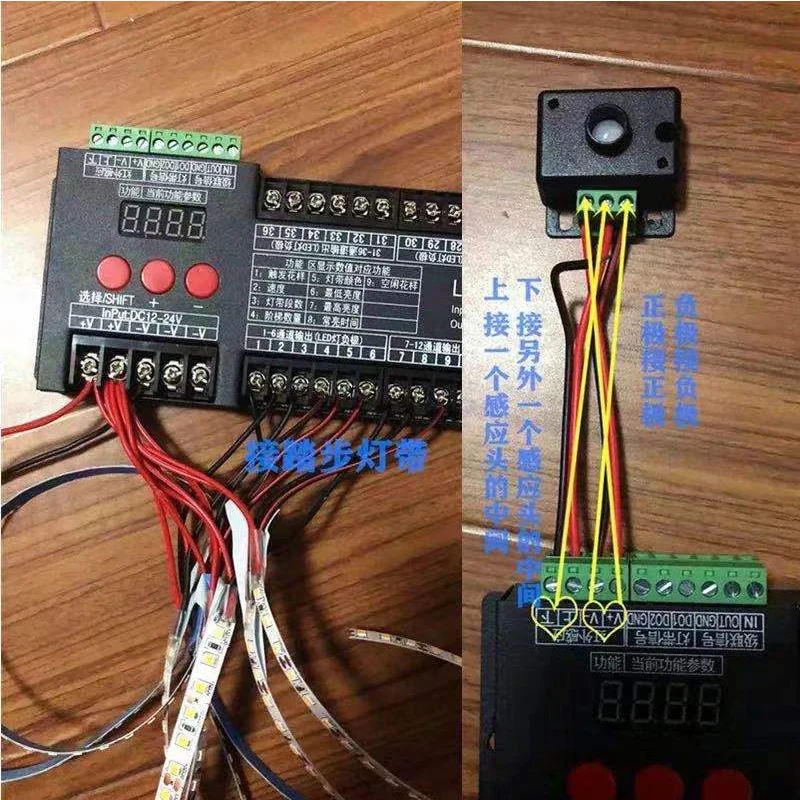 1-A/B датчики должны быть установлены на входе и выходе из лестницы и лицом к телу человека.2-продукт низкого напряжения 12V-24V, подключите к сети питания трансформатор. Не подключайте напрямую 220 В, это сгорит контроллер.3. Изделие не является водонепроницаемым.
