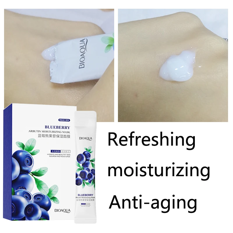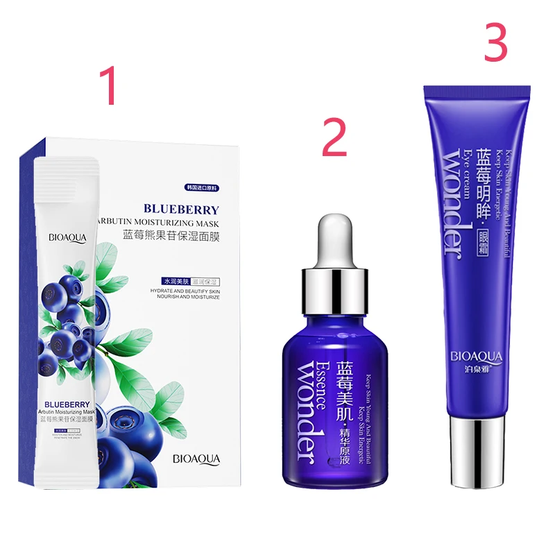 Посылка:1 x увлажняющая маска для сна для лица BIOAQUA blueberry, 20 шт.1 x BIOAQUA черника удаляет темные круги крем для глаз 20 г1 x голубика BIOAQUA Гиалуроновая кислота жидкий уход за лицом эссенция против морщин 15 мл