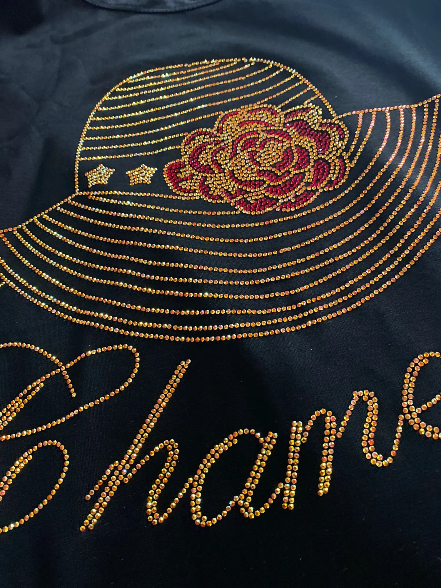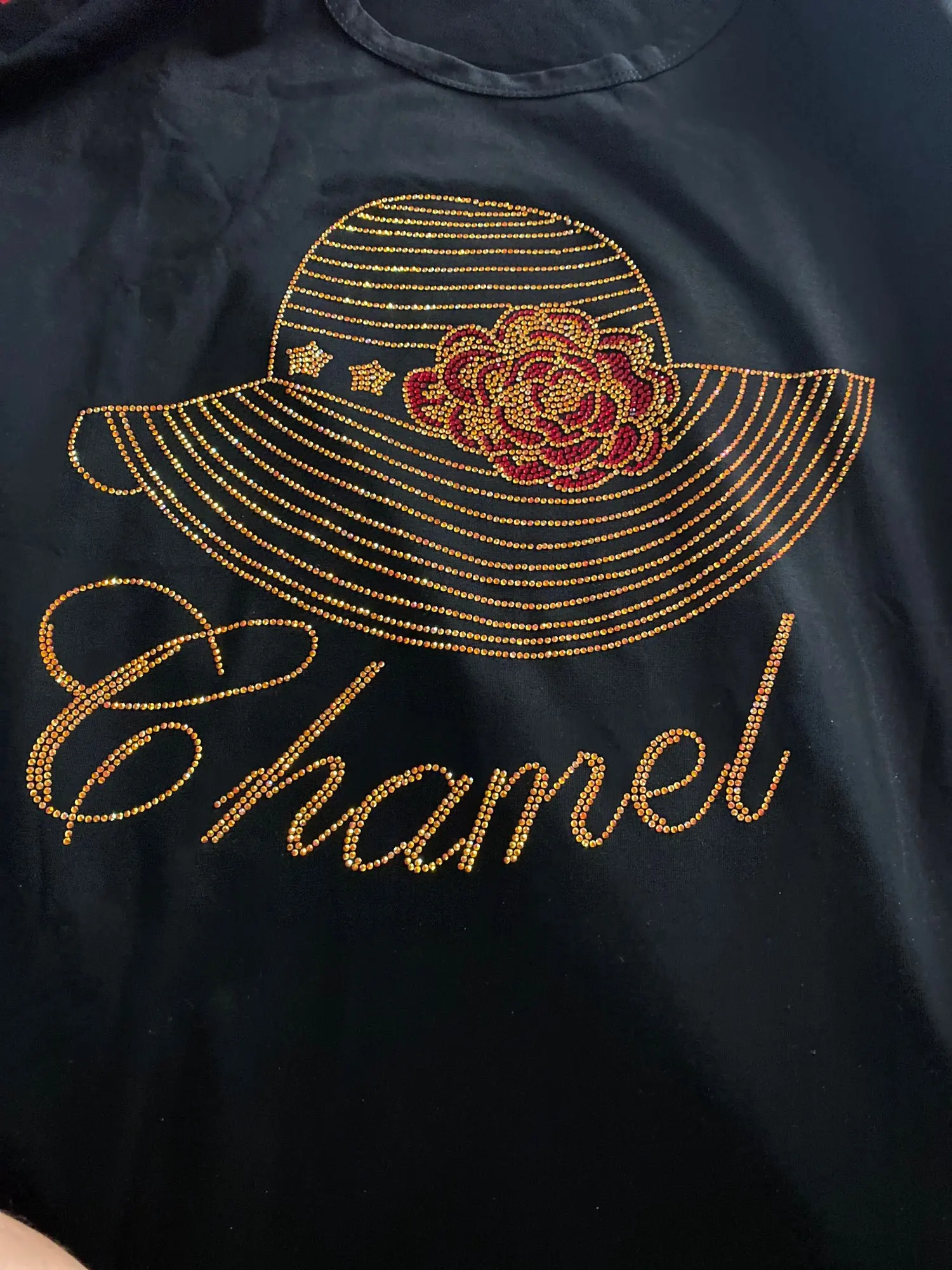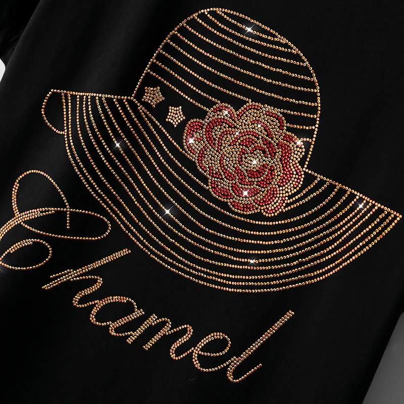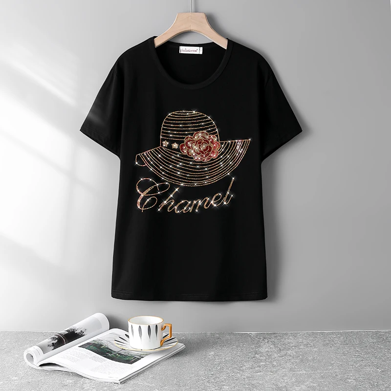 Женская хлопковая футболка с коротким рукавом, черная футболка большого размера с шапкой и стразами, модель 2022 на лето, 3532