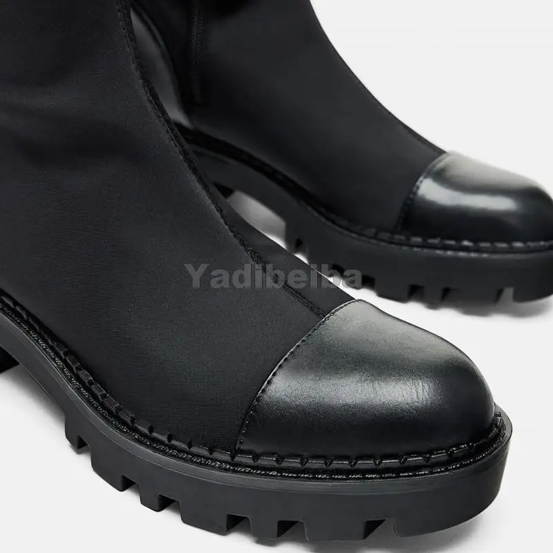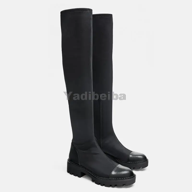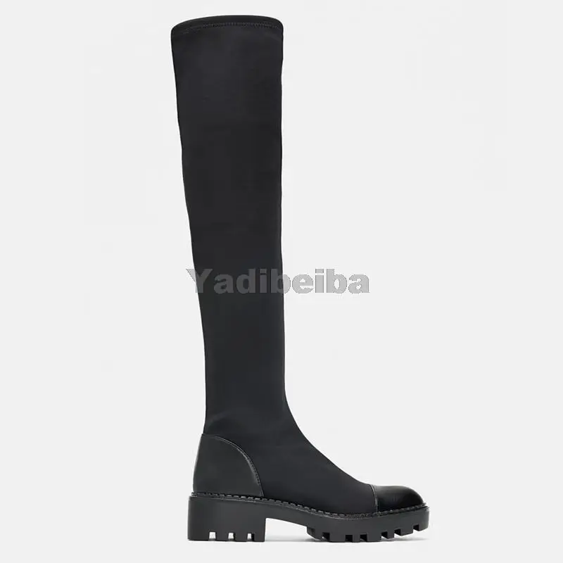 Женские сапоги выше колена, облегающие, из эластичной ткани, на пла...