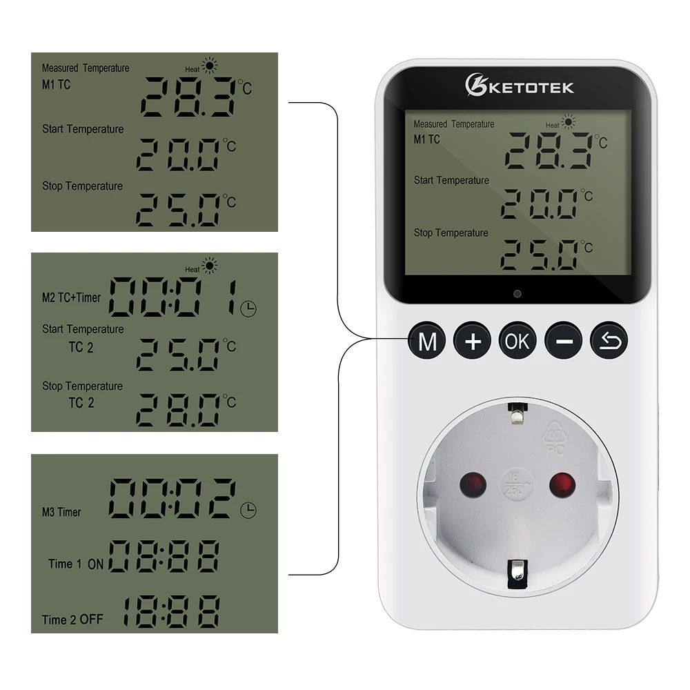 Режим работы: режим контроля температуры M1, контроль температуры M2 + таймер, можно выбрать таймер M3